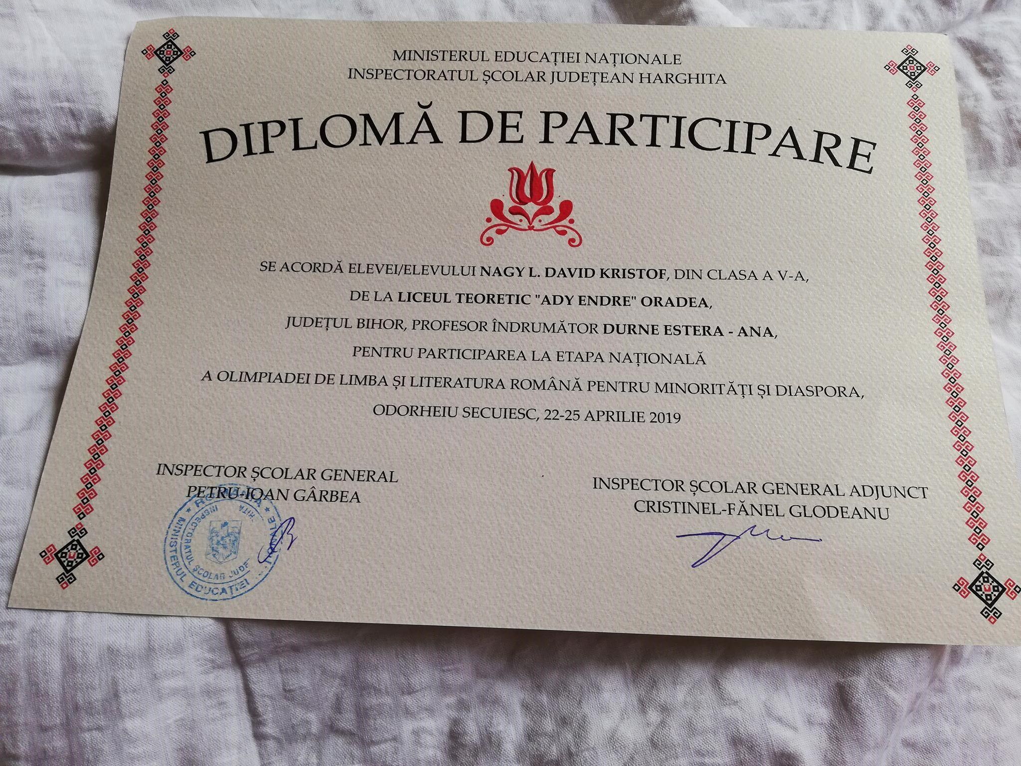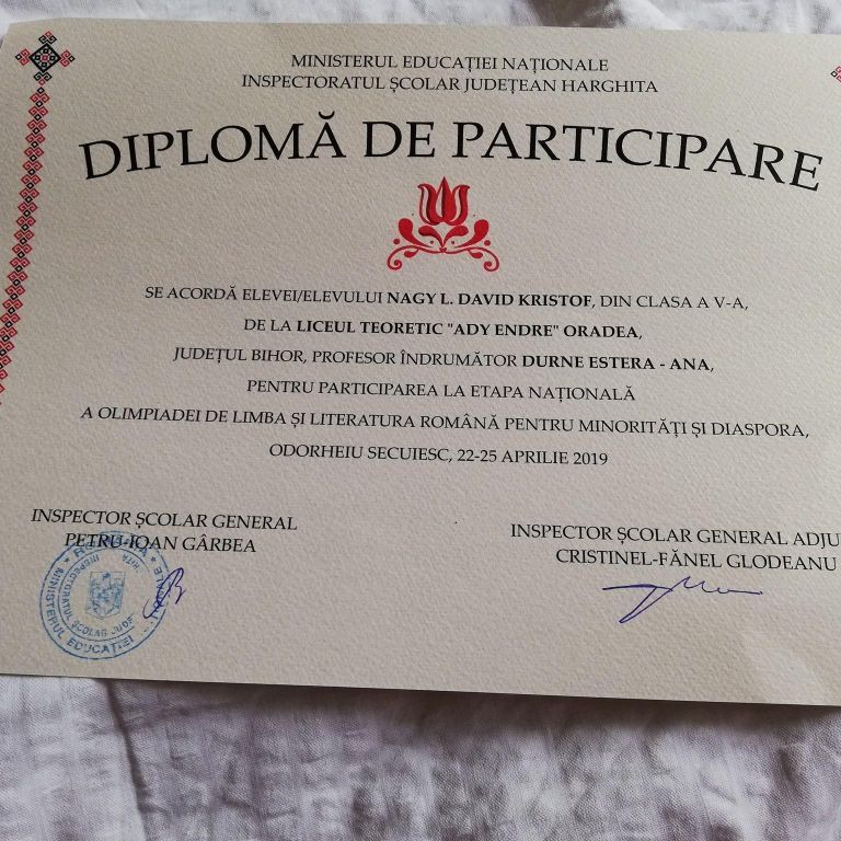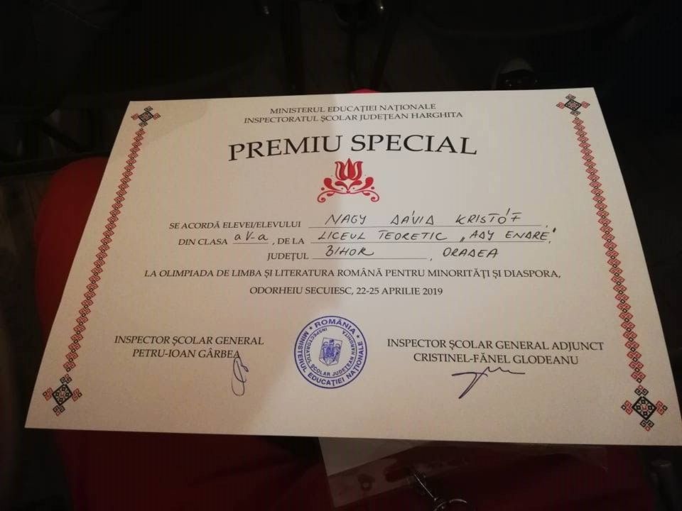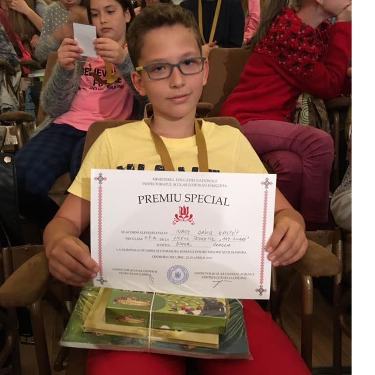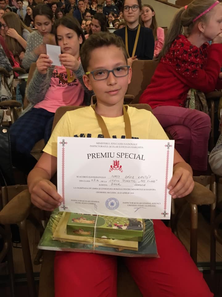 În perioada 22-25. 04. 2019, la Odorheiu Secuiesc, a avut loc Olimpiada de limba și literatura română pentru minorități și diaspora - etapa națională. În cadrul acestui concurs, elevul Nagy Dávid - Kristóf, din clasa a V-a A, a obținut Premiul Special. Ne bucurăm de rezultatul muncii lui, obținut sub îndrumarea doamnei profesoare Durne Estera. Felicitări!