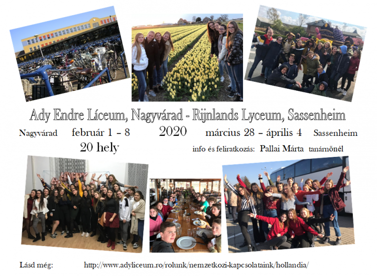 A nagyváradi Ady Endre Elméleti Líceum és a hollandiai Rijnlands Lyceum Sassenheim közötti cserediák-kapcsolat második részére az idén április 11. és 18. között került sor. Az idei év újdonságaként- a cserediákok nagy száma miatt- két csoportban érkeztek a csapatok Hollandiába, mi a litvánok társaságában élvezhettük a hazaiak vendégszeretetét.