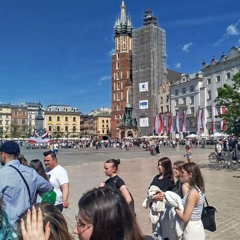 Másnap egész nap Európa egyik legszebb városát, Lengyelország kulturális fővárosát látogattuk meg, Krakkót. Először az állatkertet néztük meg, ahol sok szép és érdekes állat volt. Ezt követően elindultunk felfedezni a város szépségeit. Megnéztük közösena gyönyörű Visztula folyó partját a Waveli vár tövében, majd felsétálunk a waveli várerődítményhez, ahol megtekintettük a székesegyházat, a fejedelmi palotát, a királyi várat, utána pedig lementünk a városközpontba. Megcsodáltuk a gyönyörű főteret, a sétálóutcákat, ahol alkalmi fellépők is voltak: táncosok, művészek, lovas hintók stb. Itt meglátogattuk az apostolok templomát, Krakkó legrégebbi románkori templomát, a Posztócsarnokot, a városháza tornyát, a gyönyörű Mária- templomot, az Adalbert- templomot, Európa legnagyobb középkori a főterét, a Barbakán erőditményrendszer bástyáit,stb.