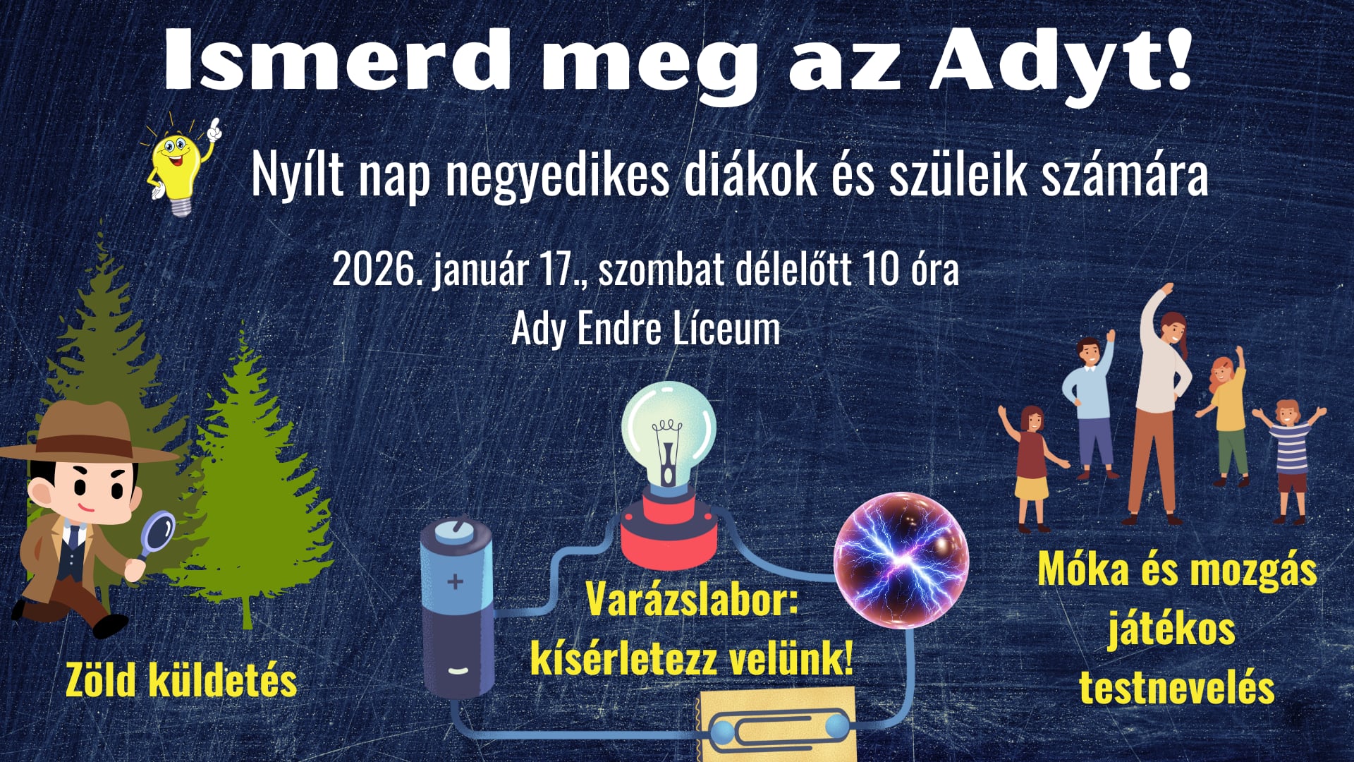 Szeretettel várjuk a negyedikes diákokat és szüleiket január 17-én, szombaton délelőtt 10 órára az Ady Endre Líceumba. A szülők számára bemutatjuk a jövő tanévi kínálatunkat, miközben a diákok az iskolára jellemző interaktív foglalkozásokon vehetnek részt.