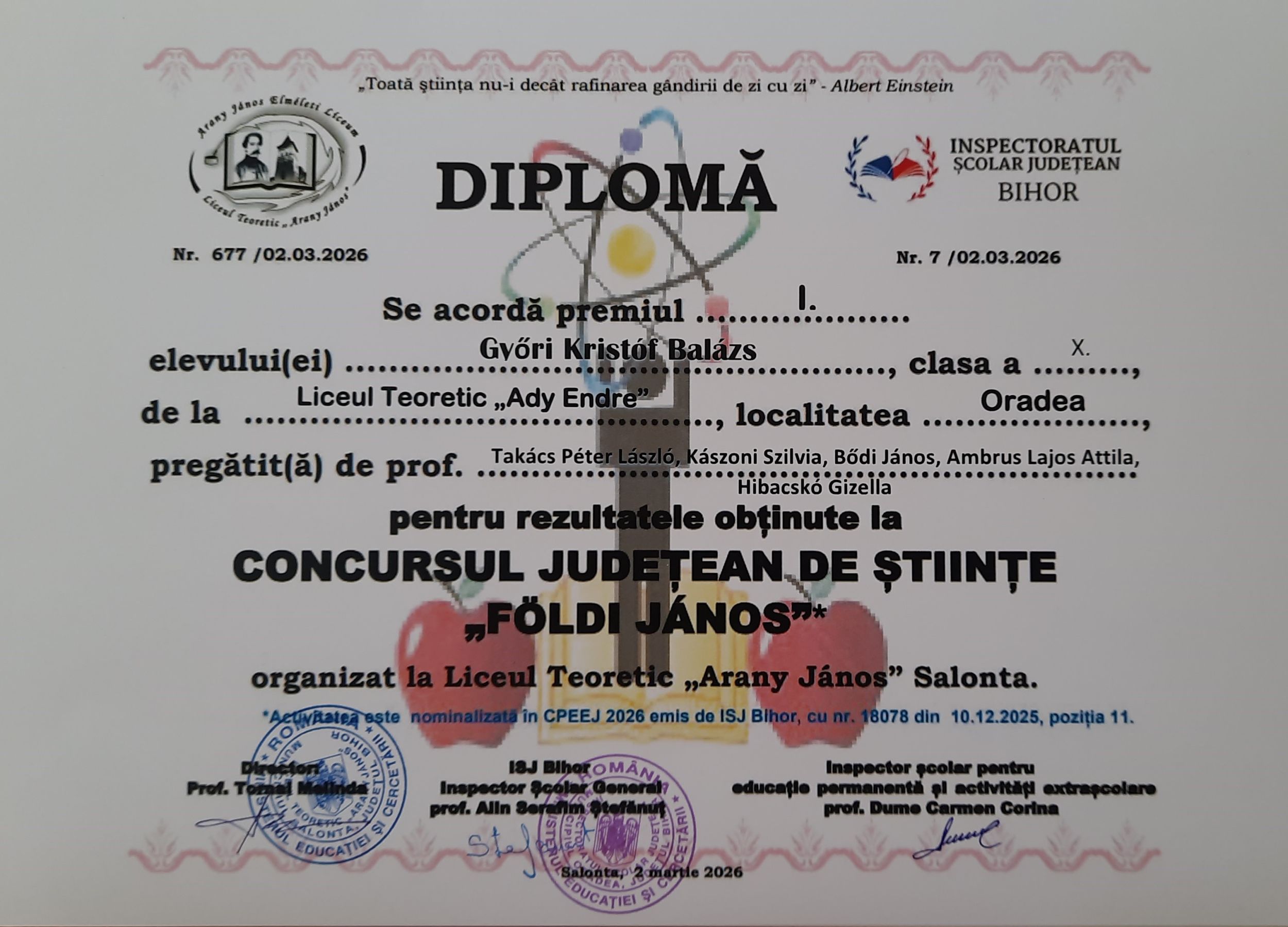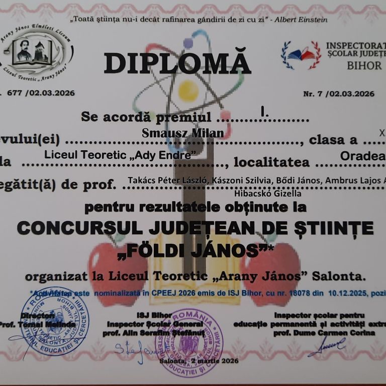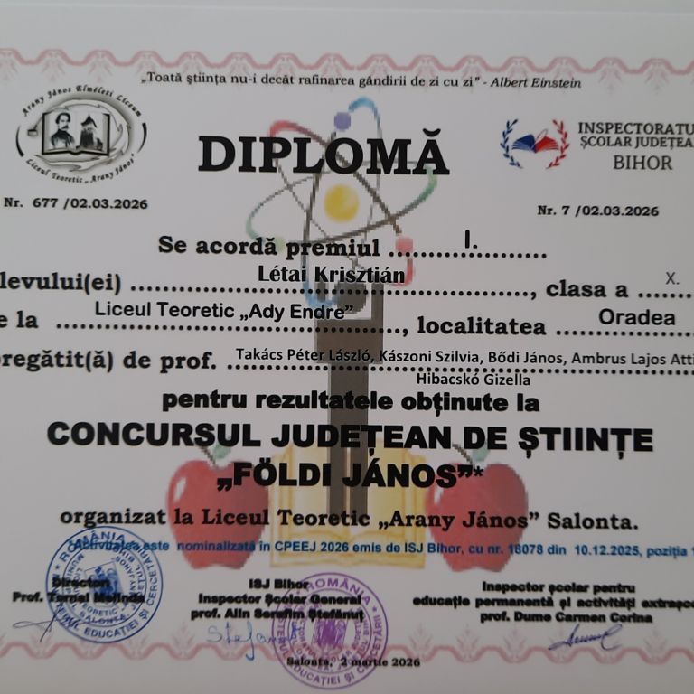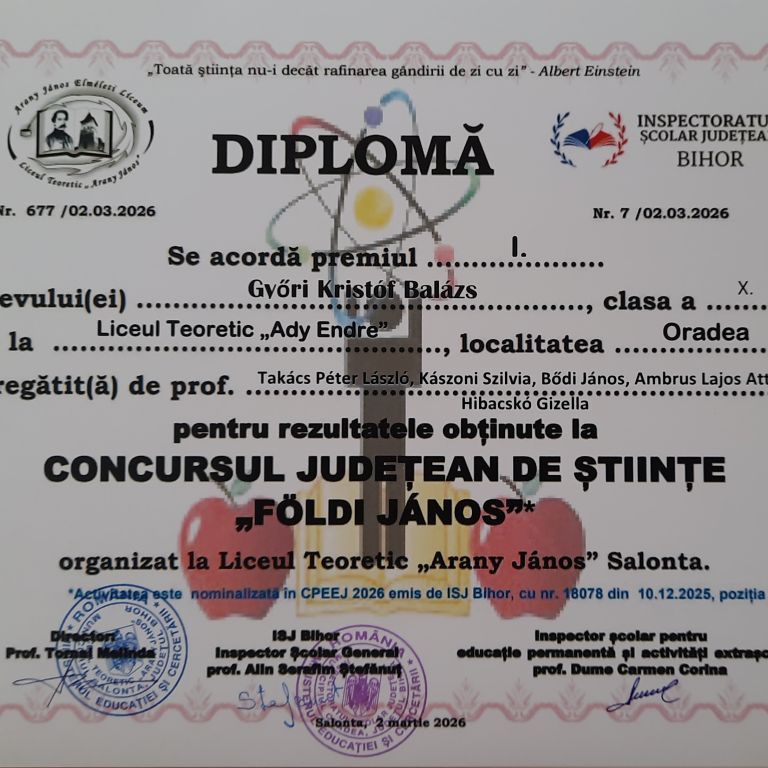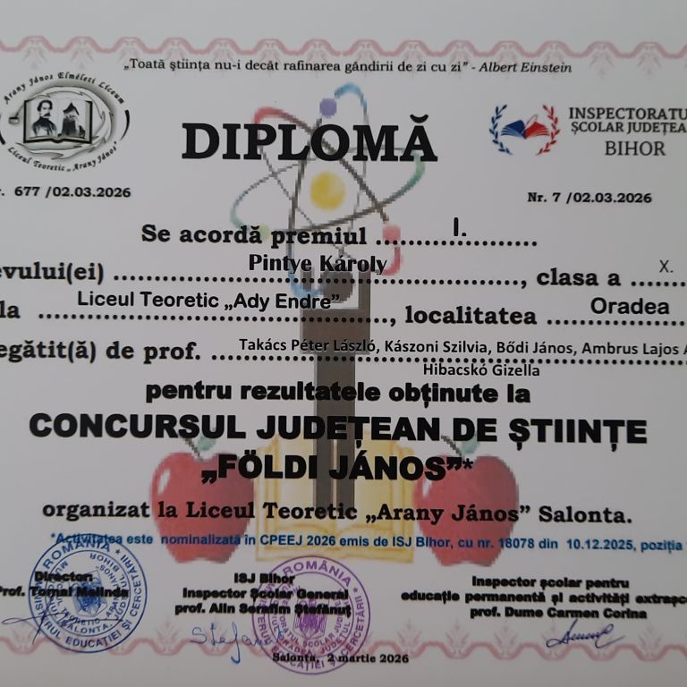 A nagyszalontai Arany János Elméleti Líceum 2026. február 13-án kilencedik alkalommal szervezte meg a Földi János megyei szintű természettudományi versenyt.