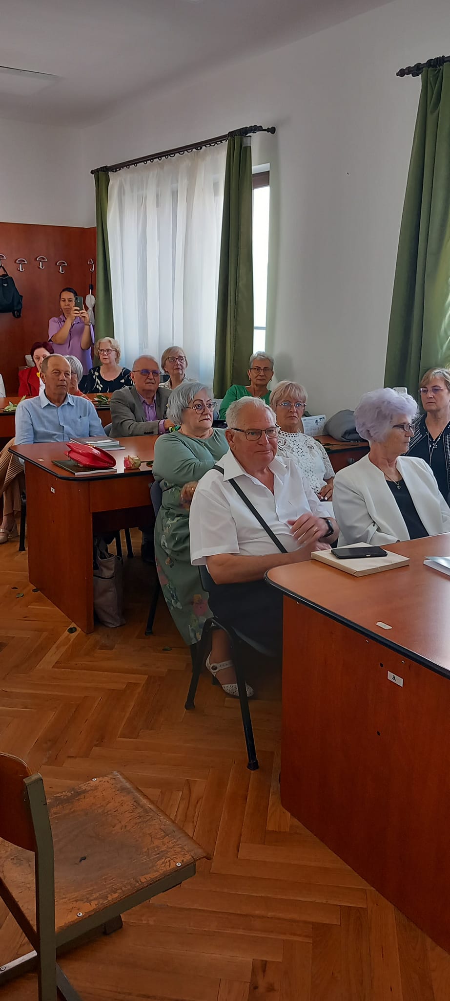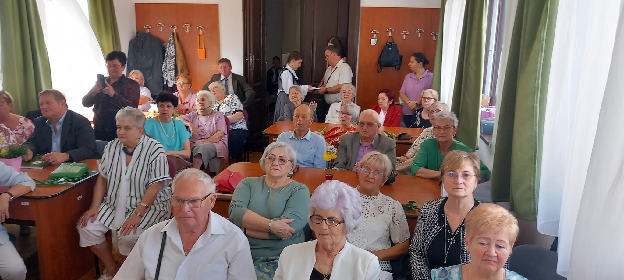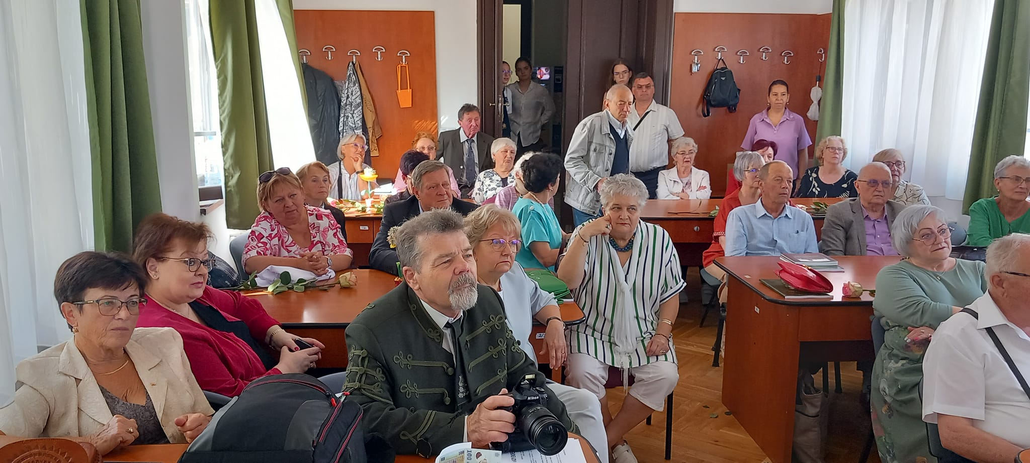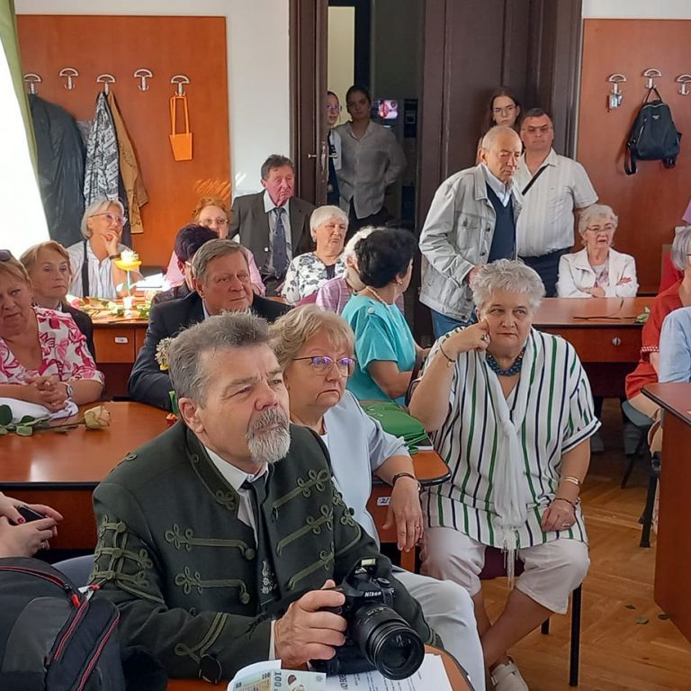 A kapusfülke melletti lépcsőnél mostani diákok igazították kedvesen útba az érkezőket, amit mindenki hálásan megköszönt, hiszen amúgy is könnyű eltévedni az iskola falai közt, jelenleg pedig a korszerűsítés miatt még inkább. A dísztermet még néhány hónapig nem lehet használni, ezért az ünnepelteket két csoportra osztották a szervezők: nagyobb részüket a tanáriba invitálták, a többieket pedig egy földszinti osztályterem felé kalauzolták.