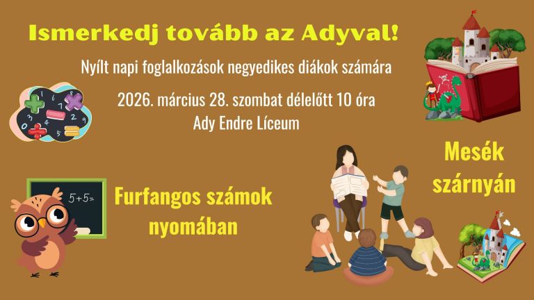 Szeretettel várjuk ismét a negyedikes diákokat 2026. március 28-án, szombaton délelőtt 10 órára az Ady Endre Líceumba, ahol a diákok olyan, az iskolára jellemző interaktív foglalkozásokon vehetnek részt, mint a Furfangos számok nyomában illetve Mesék szárnyán.