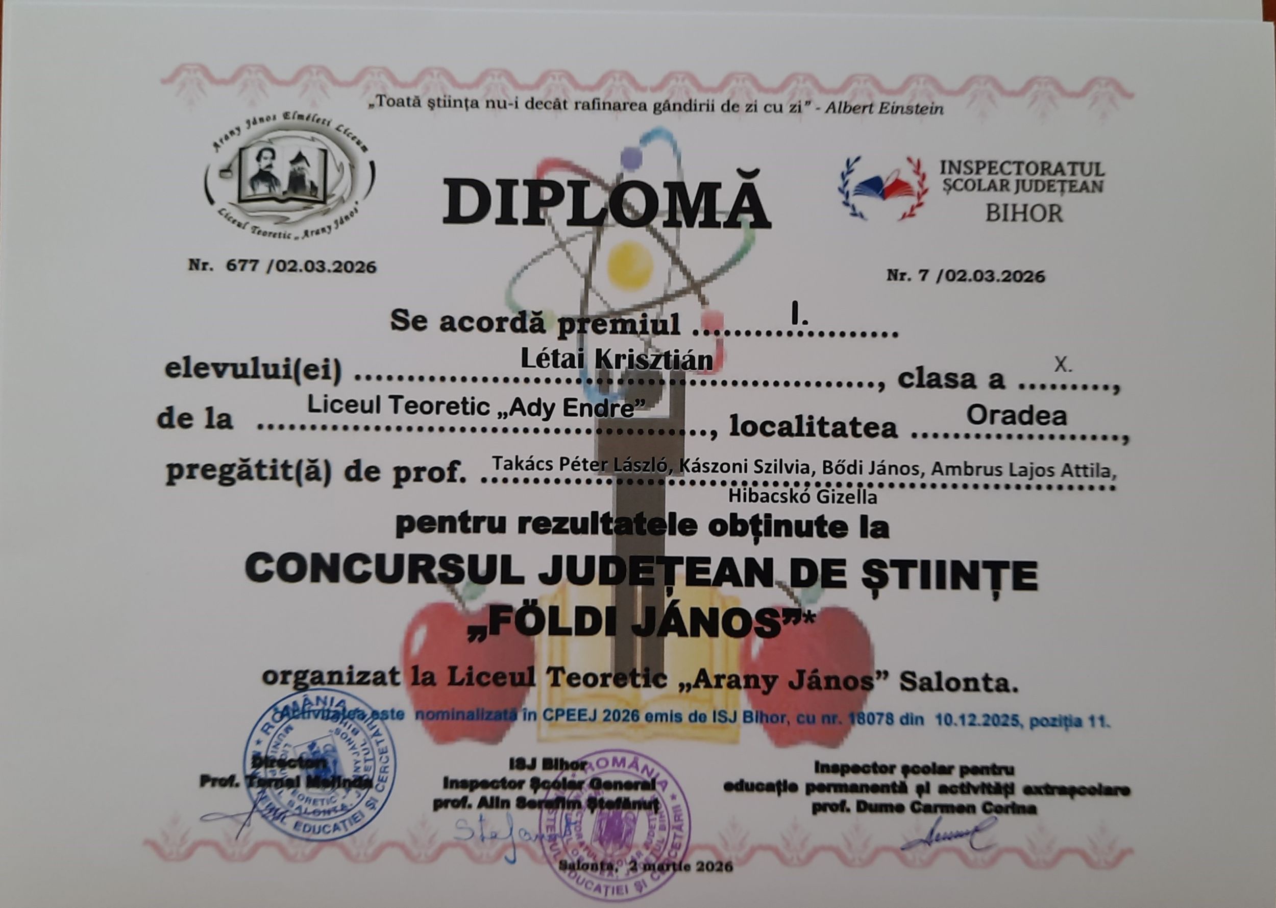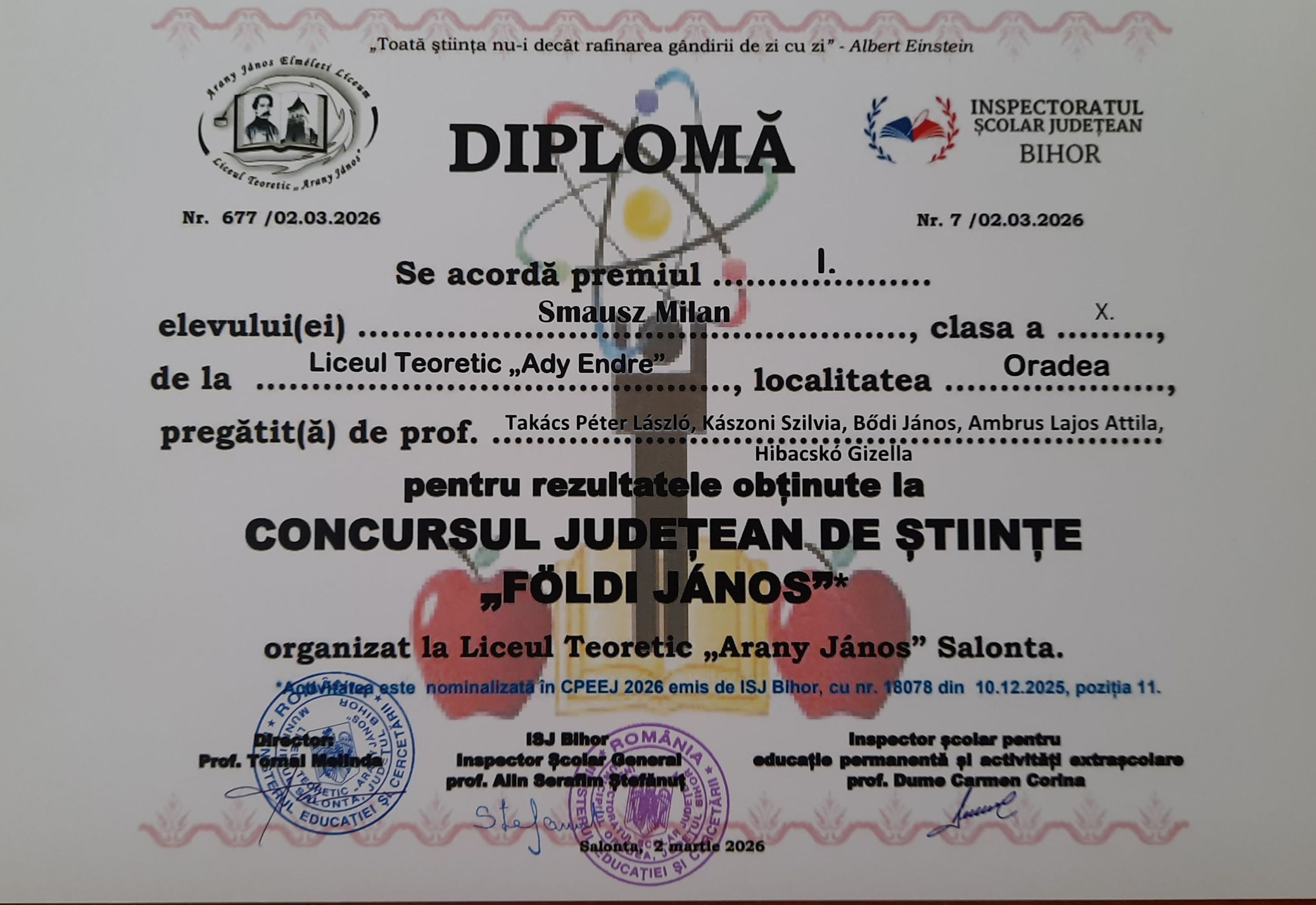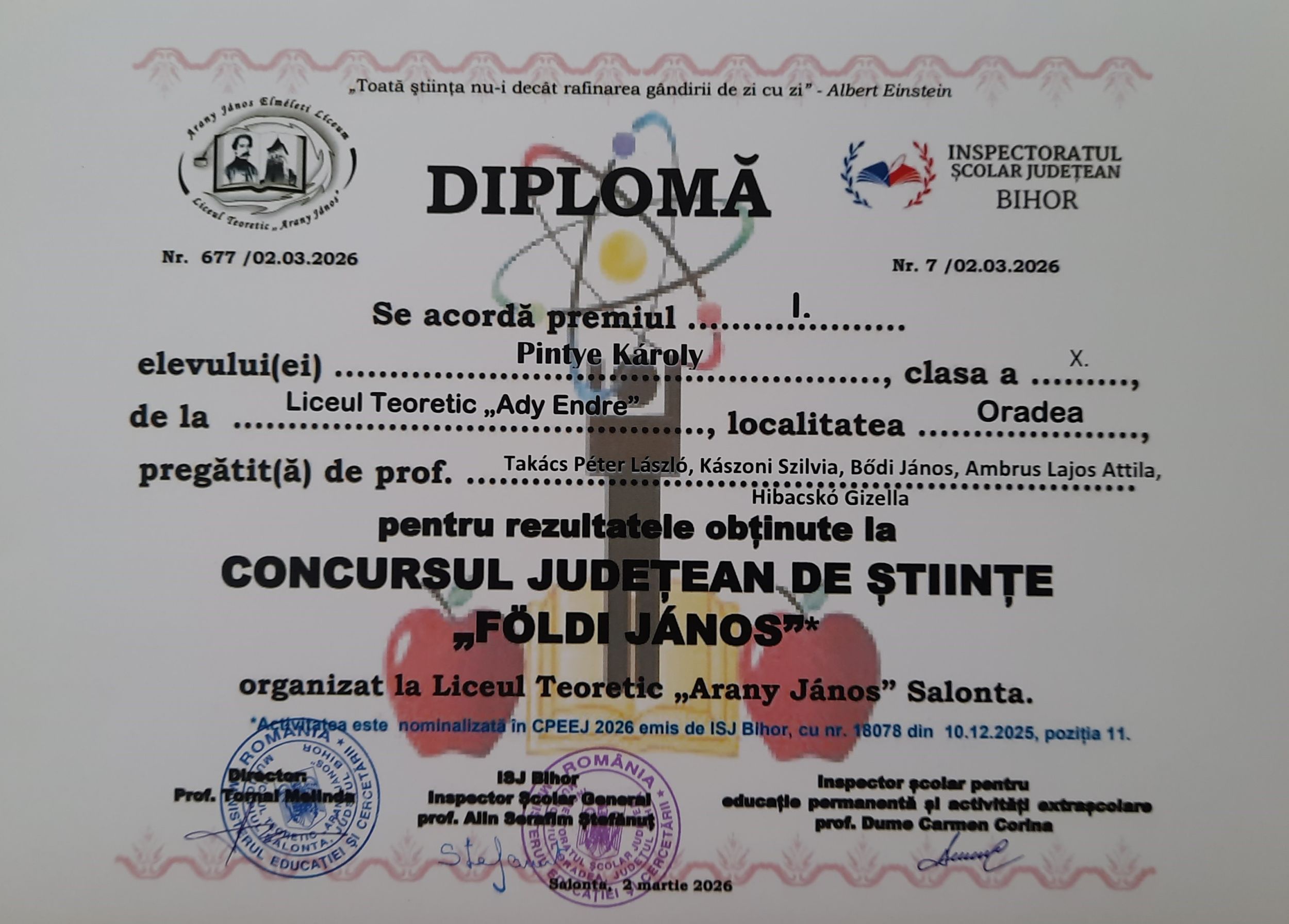 A nagyszalontai Arany János Elméleti Líceum 2026. február 13-án kilencedik alkalommal szervezte meg a Földi János megyei szintű természettudományi versenyt.