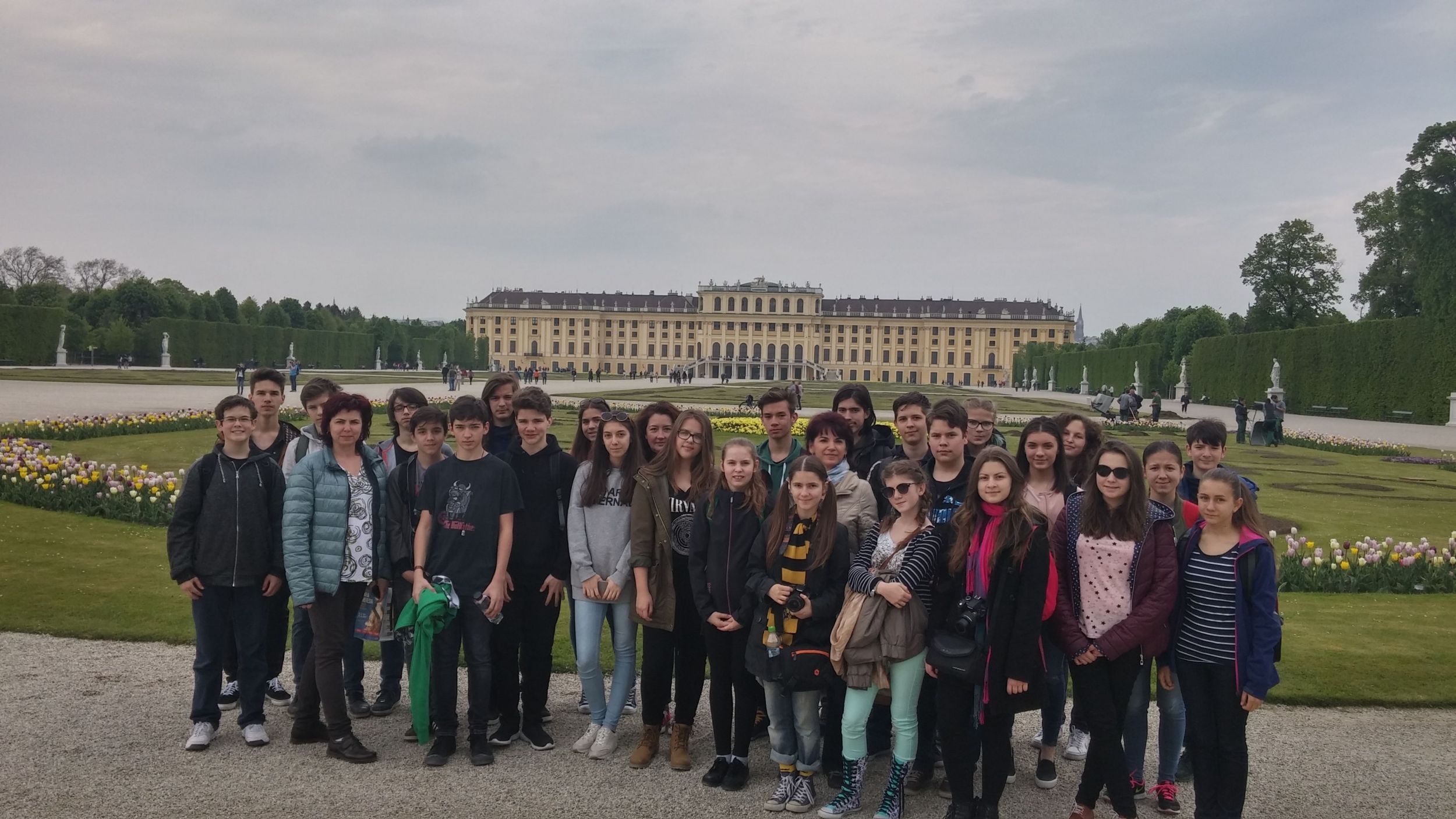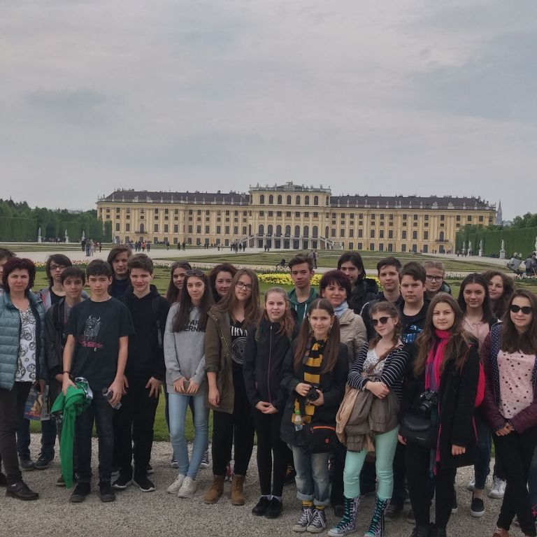 A schönbrunni kastély volt kirándulásunk utolsó állomása. I. Ferenc József és Erzsébet, azaz Sissi császárné, illetve Mária Terézia nyári rezidenciája a pompájával, eleganciájával, a császári család személyes és berendezési tárgyainak látványával nyűgözött le. A kastély bejárását a belépéskor kapott úgynevezett audioguide-ok használata tette kényelmessé és gördülékennyé. A kastély kertjében a görög mitológiát idéző szobrok, szoborcsoportok, szökőkutak, a szabályos fasorok, gyönyörű virágok tették kellemessé a sétát. A bátrabbak a labirintusba is bemerészkedtek. A schönbrunni állatkertben, bár a tigris, az oroszlán, a gepárd éppen délutáni sziesztáját töltötte, lehetőség adódott különleges madárfajok megcsodálására, a pingvinek és jegesmedvék víz alatti úszásának, játszadozásának megfigyelésére.