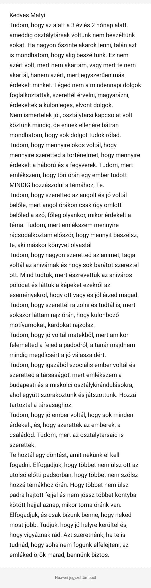 Tudom, hogy jó ember voltál, hogy sok minden érdekelt, és hogy szerettek az emberek, a családod. Tudom, mert az osztálytársaid is szerettek.
