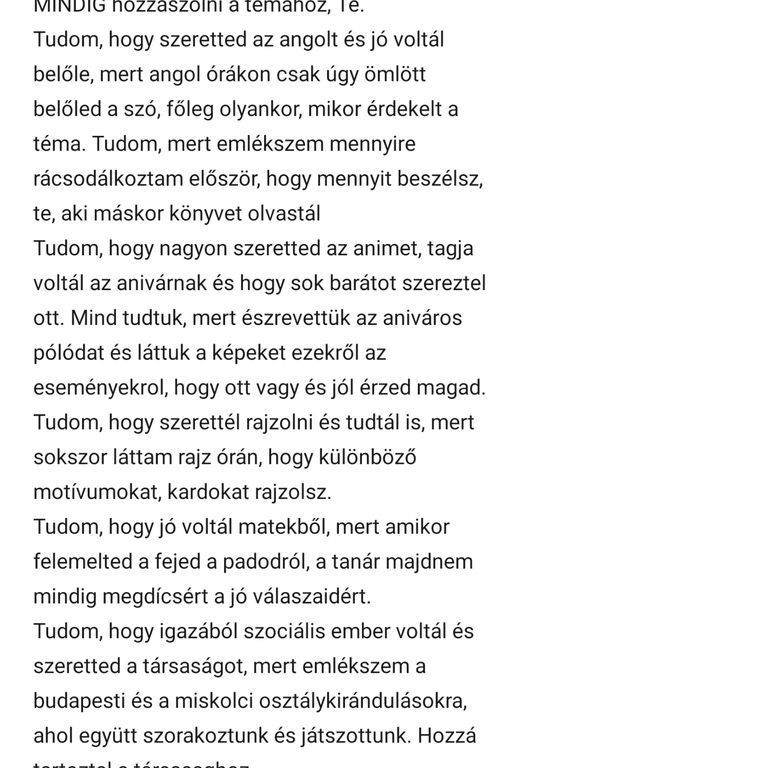 Tudom, hogy nagyon szeretted az animet, tagja voltál az Anivárnak és hogy sok barátot szereztél ott. Mind tudtuk, mert észrevettük az aniváros pólódat, és láttuk a képeket ezekről az eseményekről, hogy ott vagy, és jól érzed magad. Tudom, hogy szerettél rajzolni és tudtál is, mert sokszor láttam rajzórán, hogy különböző motívumokat, kardokat rajzolsz. Tudom, hogy jó voltál matekből, mert amikor felemelted a fejed a padodról, a tanár majdnem mindig megdicsért a jó válaszaidért.