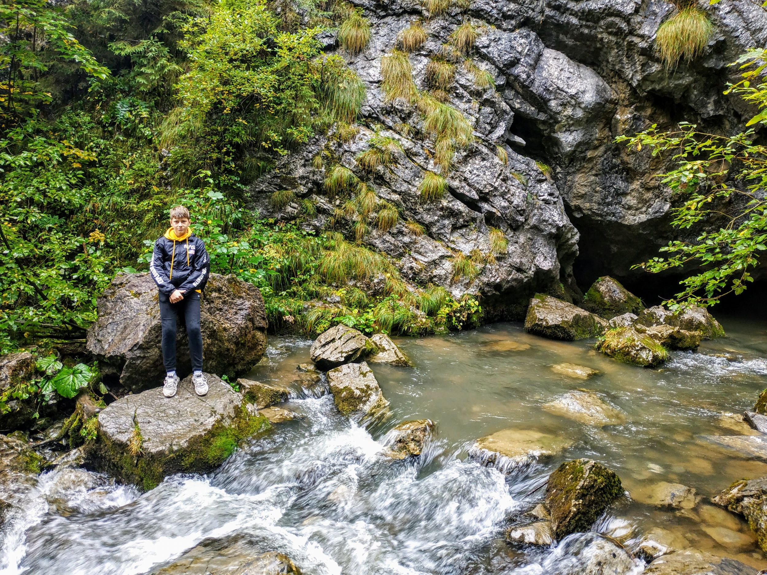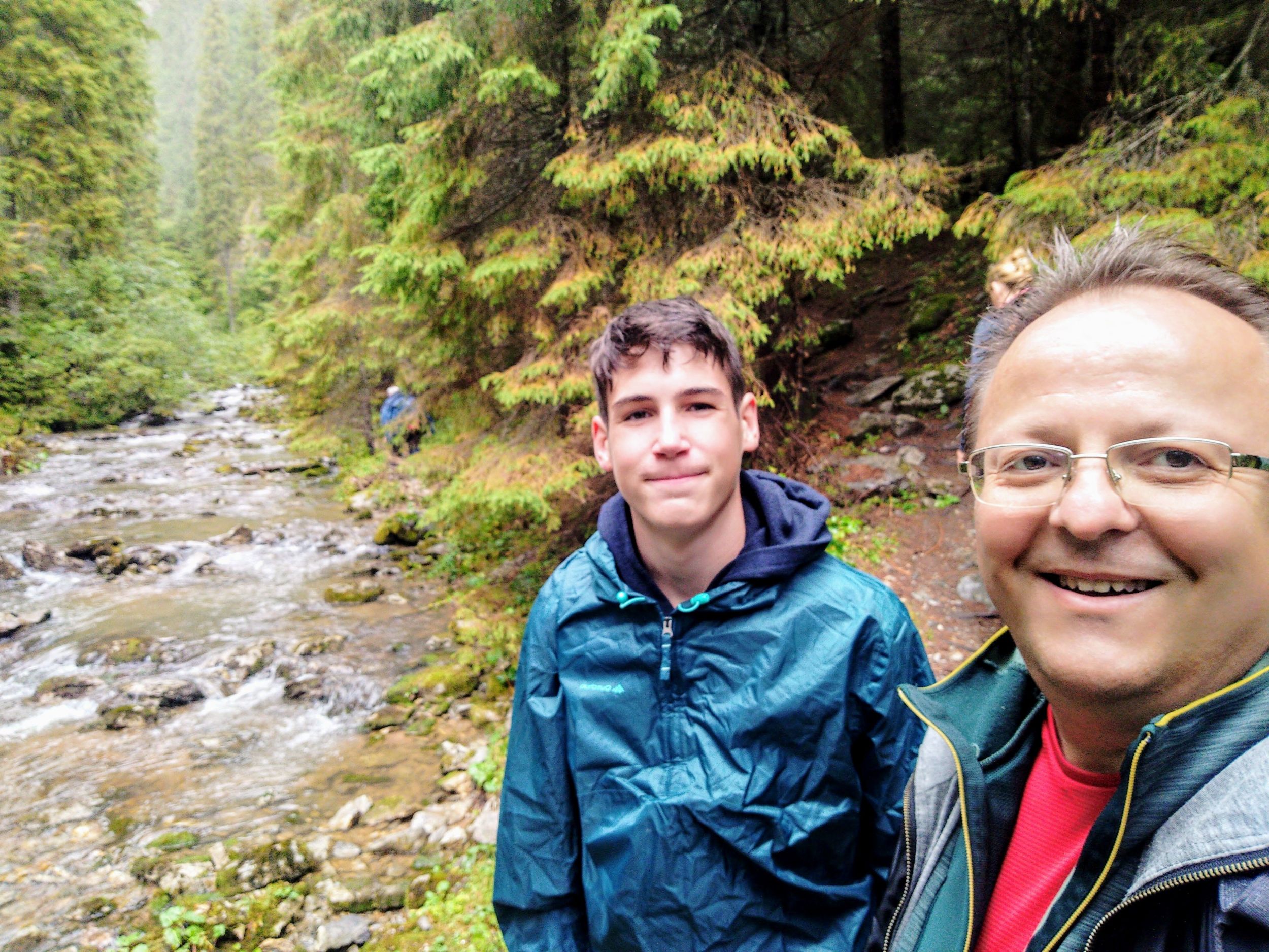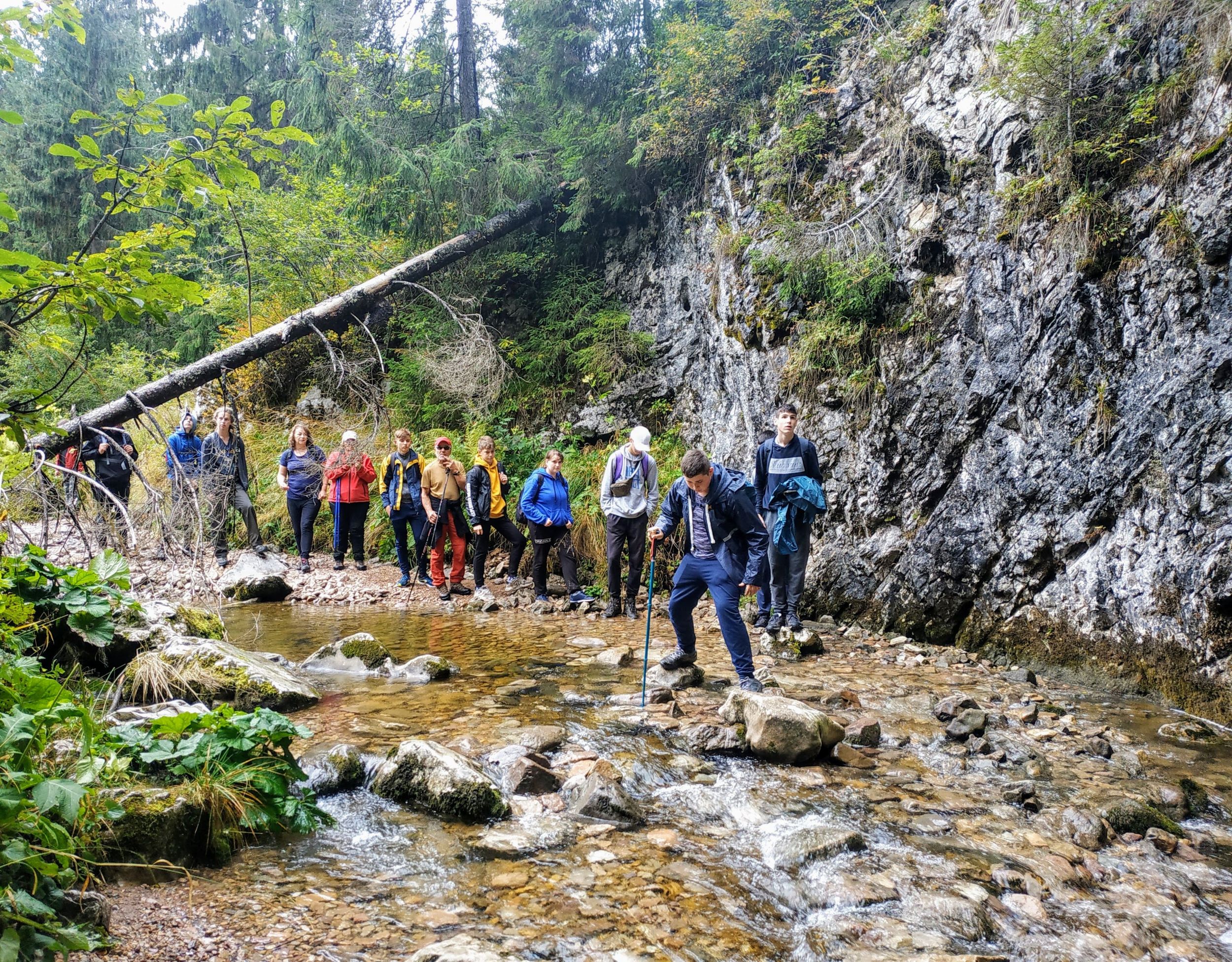 Egy adott ponton, az út bevezetett a fenyves fái közé, és hirtelen meredekké vált. Ez még nem jelentett volna gondot, de az esőnek köszönhetően nagyon csúszós is lett. Minden lépést mérlegelni, előre ki kellett számítani, és ennek dacára is sokan csúszkáltak a nedves gyökereken és sáros talajon. A keserves ereszkedést békés patakcsobogás hangja próbálta enyhíteni. Körülbelül 200 méter szintkülönbséget ereszkedtünk lassú tempóban, amikor a fenyők között megpillantottunk egy tisztást. Az is, aki először járt ezen a vidéken érezte, hogy a szenvedésnek rövid időre vége. Az eddig békésen csordogáló patakba jobbról belefolyt a Ponor-vízkeletből előtörő, a Pádisi-fennsík vizeit a föld alatt összegyűjtő vízfolyás.