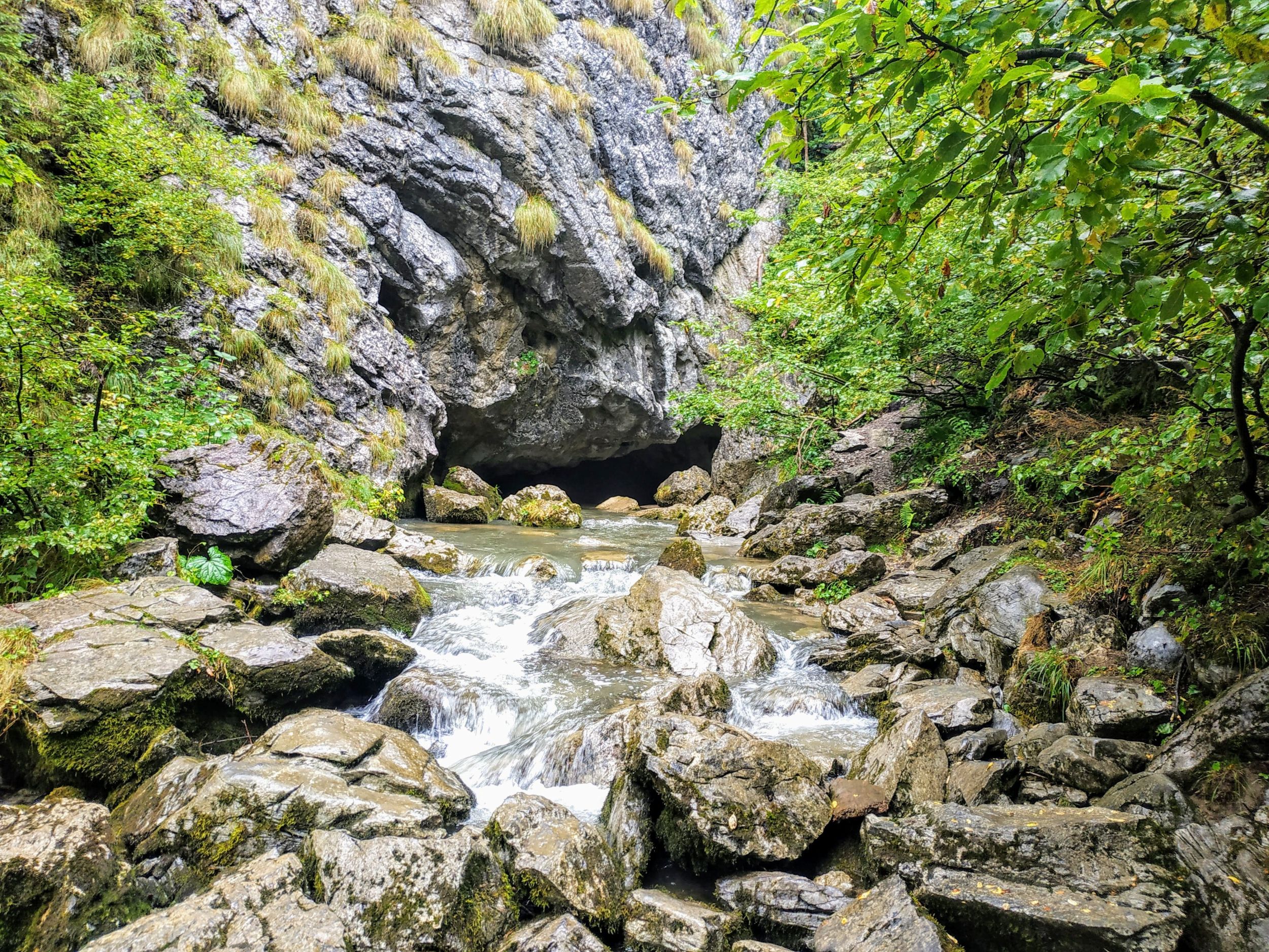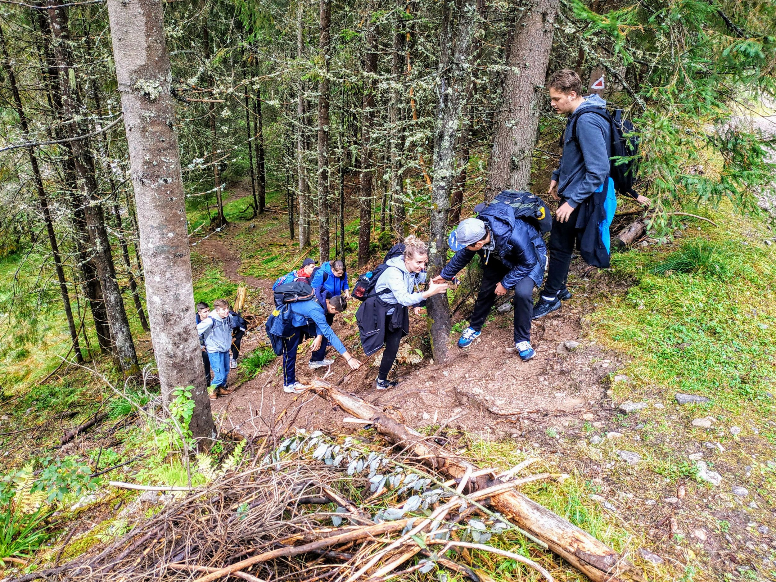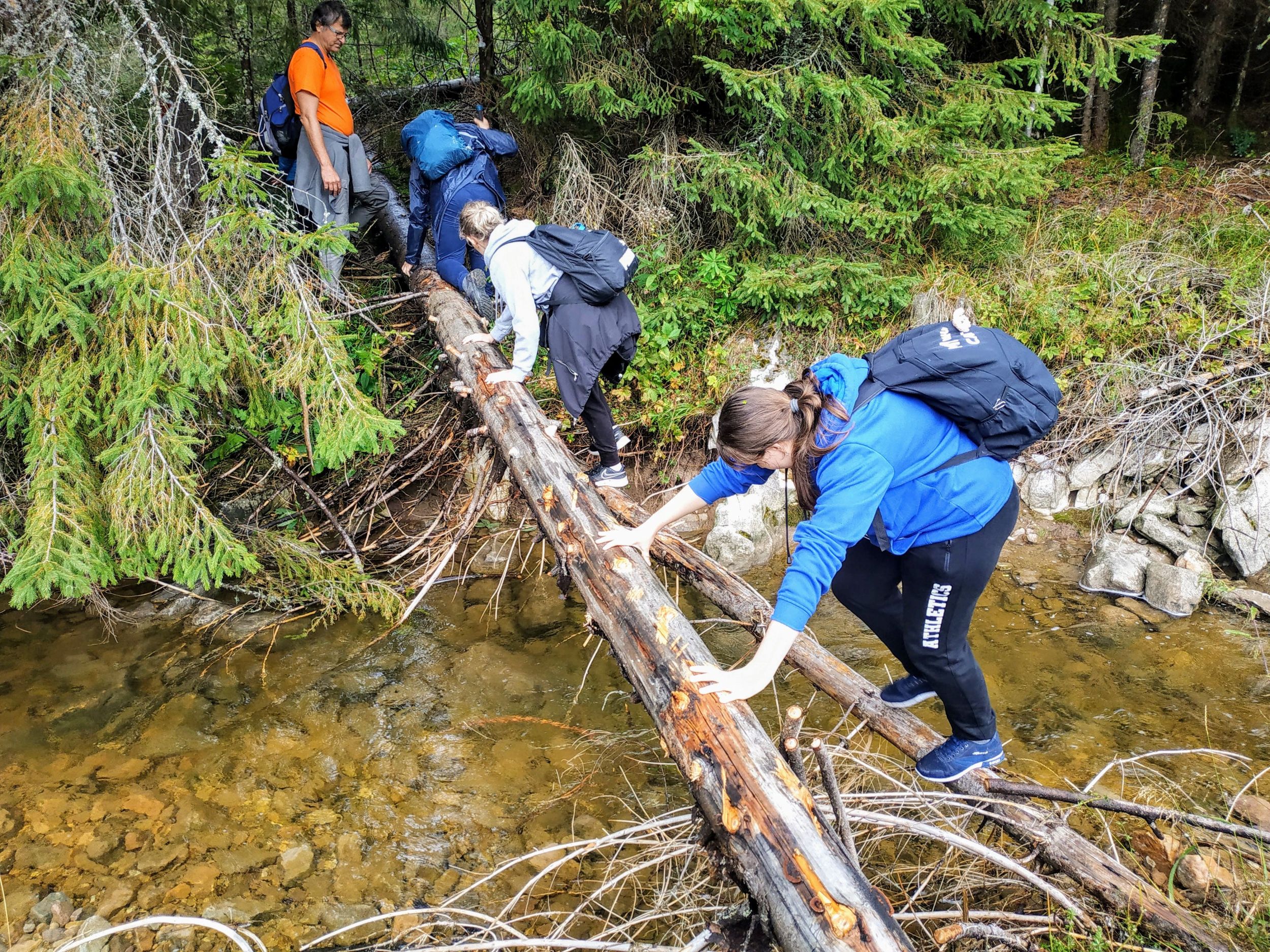 Egy adott ponton, az út bevezetett a fenyves fái közé, és hirtelen meredekké vált. Ez még nem jelentett volna gondot, de az esőnek köszönhetően nagyon csúszós is lett. Minden lépést mérlegelni, előre ki kellett számítani, és ennek dacára is sokan csúszkáltak a nedves gyökereken és sáros talajon. A keserves ereszkedést békés patakcsobogás hangja próbálta enyhíteni. Körülbelül 200 méter szintkülönbséget ereszkedtünk lassú tempóban, amikor a fenyők között megpillantottunk egy tisztást. Az is, aki először járt ezen a vidéken érezte, hogy a szenvedésnek rövid időre vége. Az eddig békésen csordogáló patakba jobbról belefolyt a Ponor-vízkeletből előtörő, a Pádisi-fennsík vizeit a föld alatt összegyűjtő vízfolyás.