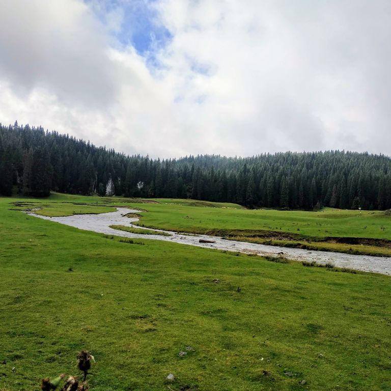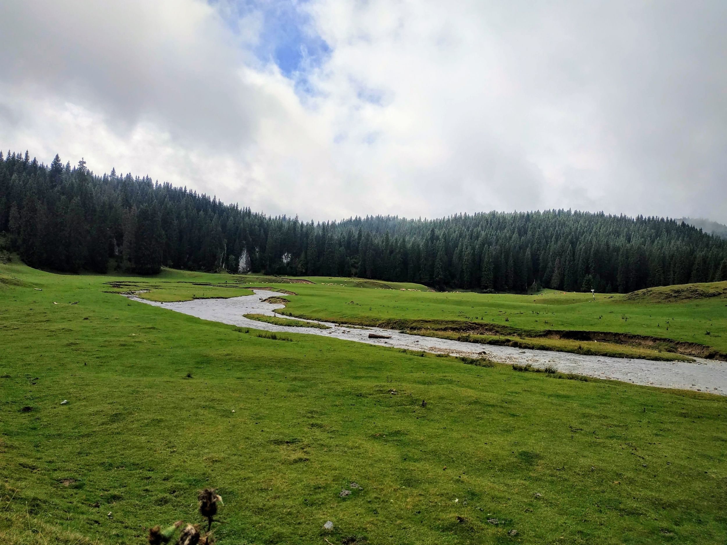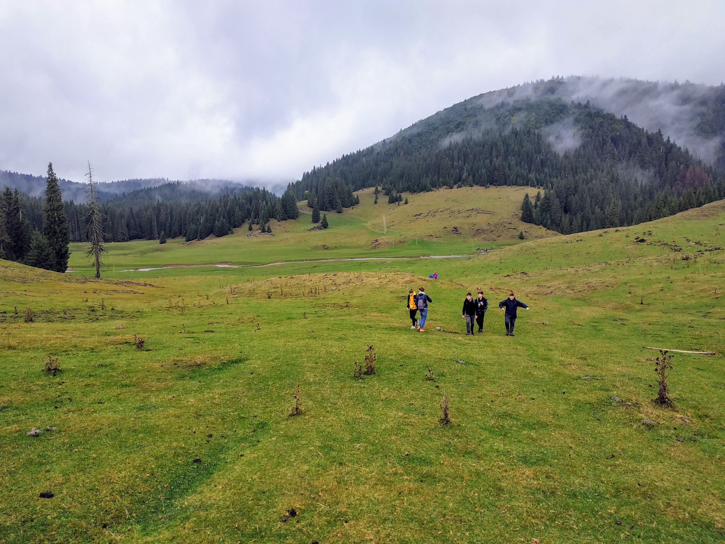Ottjártunkkor, mintha a természet meg akart volna jutalmazni, hogy eddig kitartottunk, hirtelen elállt az eső, és kisütött a nap. Jólesett egy kicsit megpihenni a melegítő napsugarak fényében, a fenyvesek fölött felszálló pára varázsától megigézve. Szavakkal leírhatatlan az az érzés, hogy egy rét mennyire magával tudja ragadni a turistát. Nem lehet betelni a látvánnyal! Sajnos, nem sokáig tartott a mágikus pillanat, egyik percről a másikra ismét beborult, és újra esni kezdett. Gyorsan felszedelőzködtünk, és immár egy jelöletlen ösvényen balra tartottunk a Medve-völgy irányába.