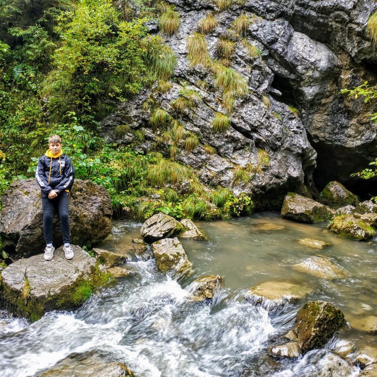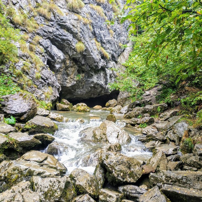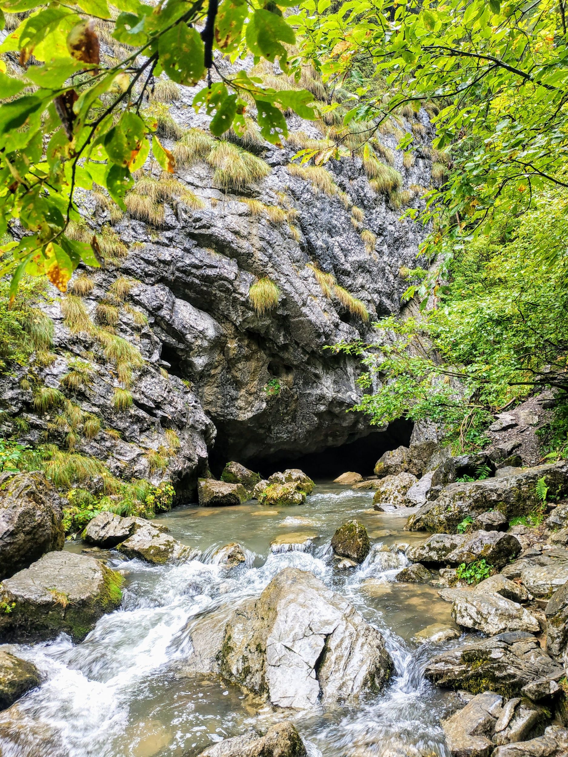 Jól látható, köves úton folytattuk a túrát a Hamlet-barlang irányába. A völgyben addig kell haladni, ameddig az úton jobb kéz felől egy félig kész épület romjait pillantjuk meg. A romok mögött kell a Medve-patakon átkelni, majd a vízfolyást követve elénk tárul a különös nevet viselő barlang. A Hamlet-barlang (Peștera Căput) összegyűjti és elnyeli a Medve-völgybeli vizeket. Az elmúlt napok esőzéseinek köszönhetően, a patak vize szinte minden átkelést segítő követ ellepett. Szerencsénkre, láthatatlan segítő kezek két kidőlt fát olyan módon fektettek a patak fölé, hogy ha még kalandosan is, de át tudtunk kelni a patak vizén. A gyerekek nagyon élvezték a farönkökön való egyensúlyozást.