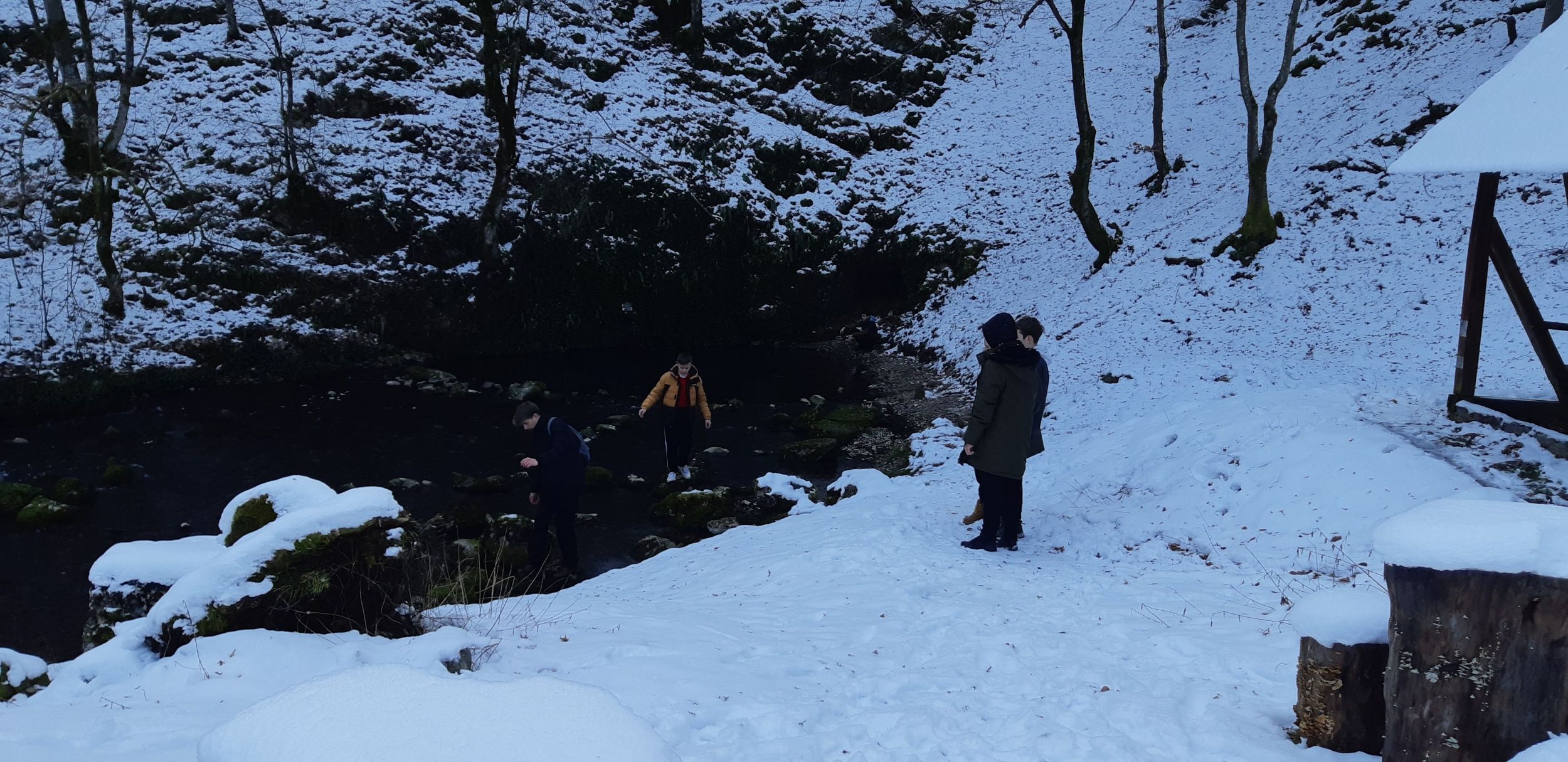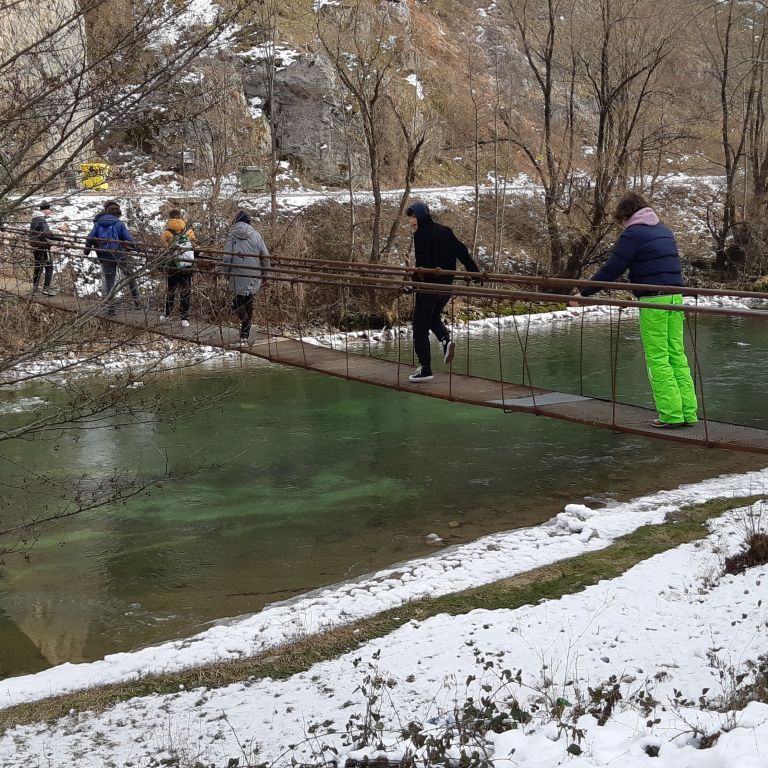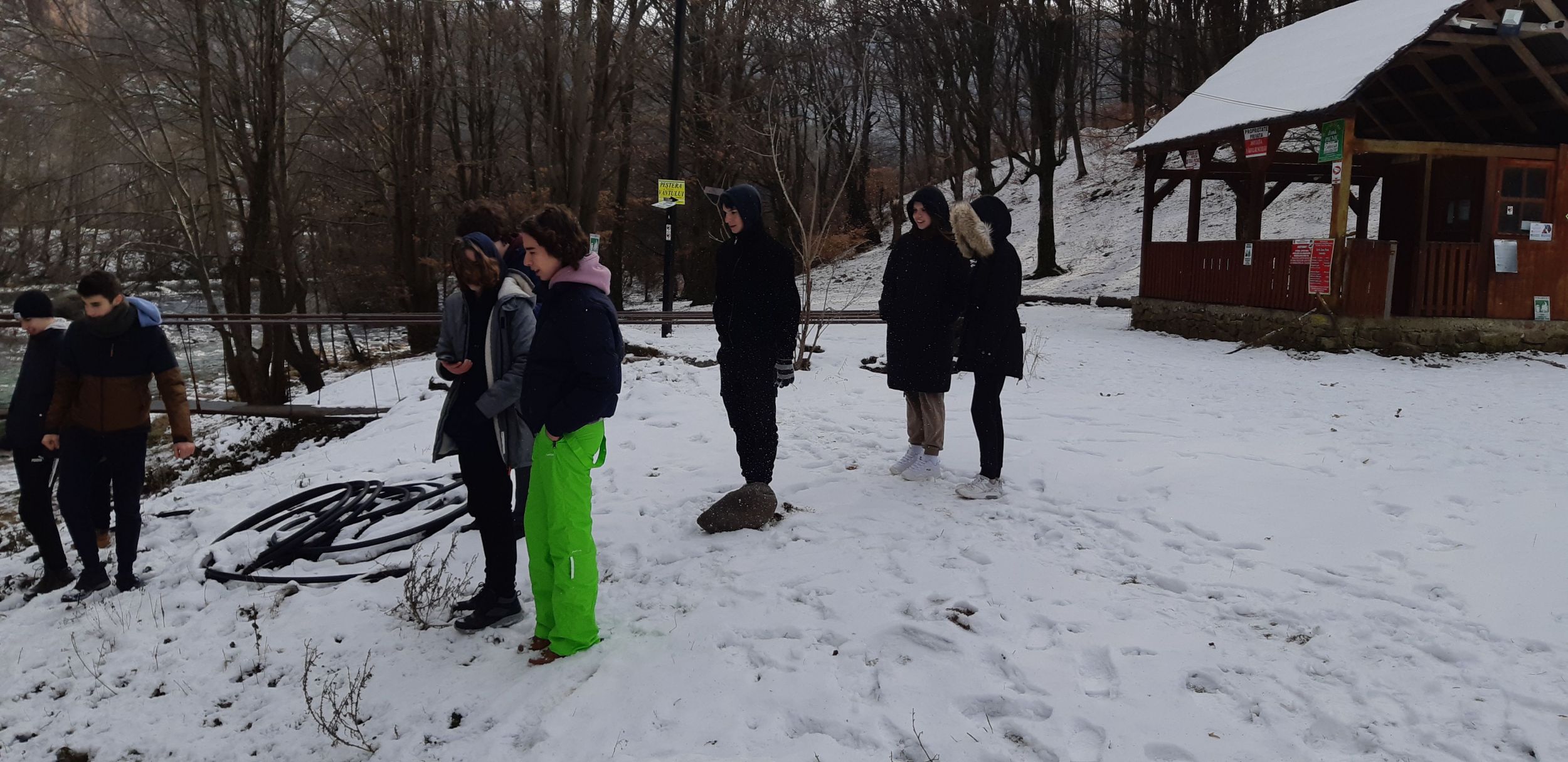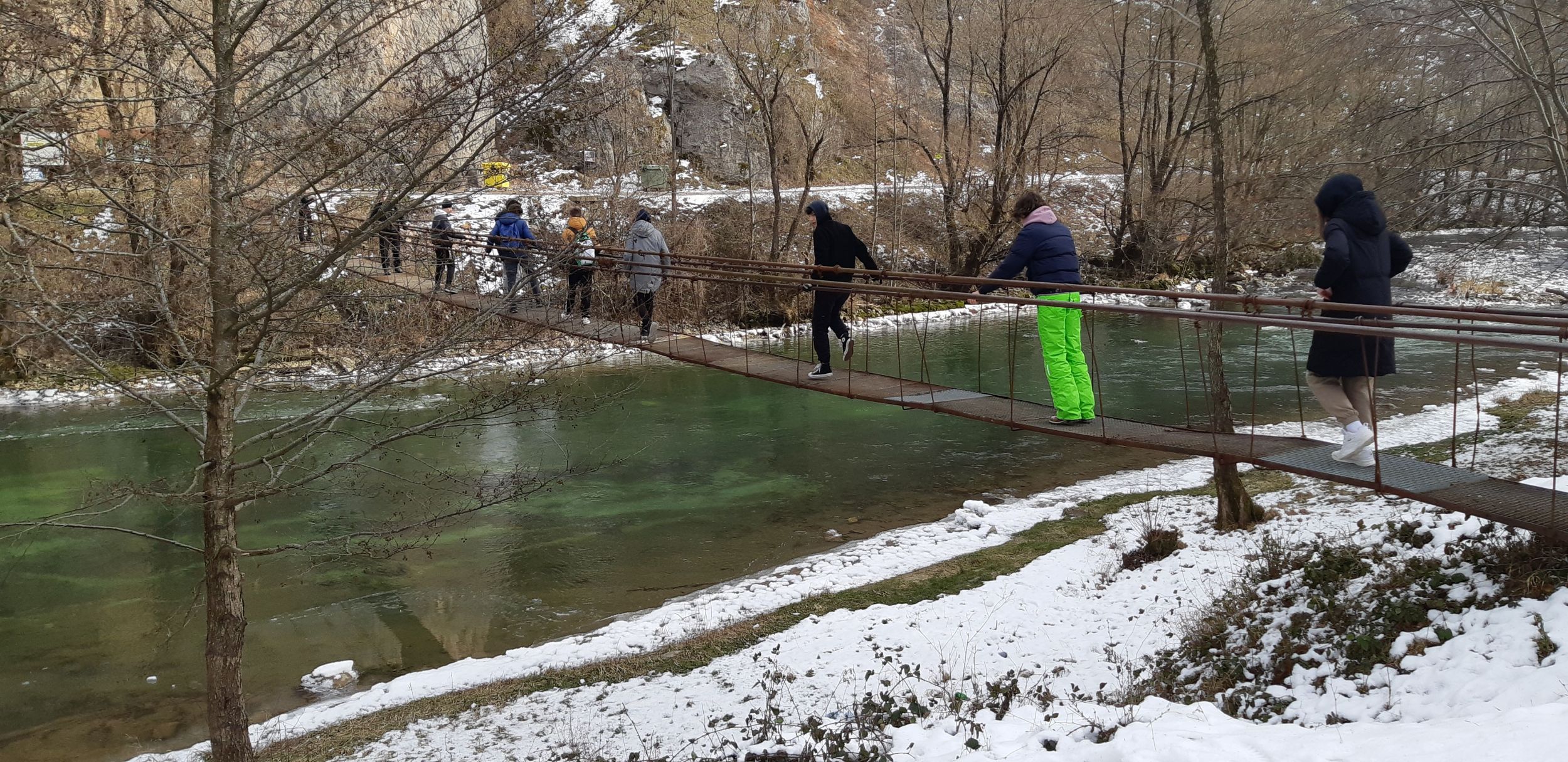Visszafelé egy másik lengőhídnál megálltunk kicsit hógolyózni, a havas tájban gyönyörködni.