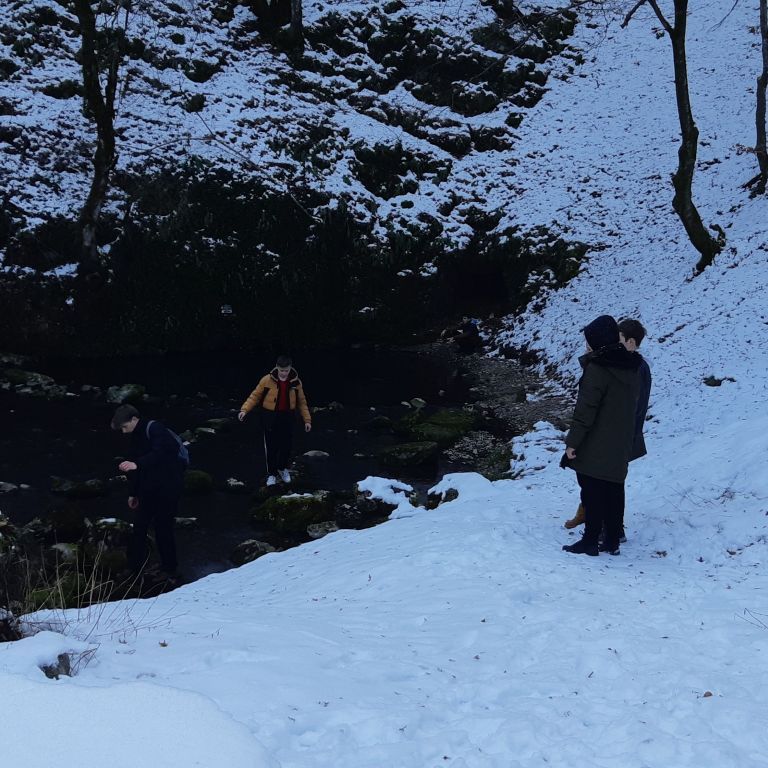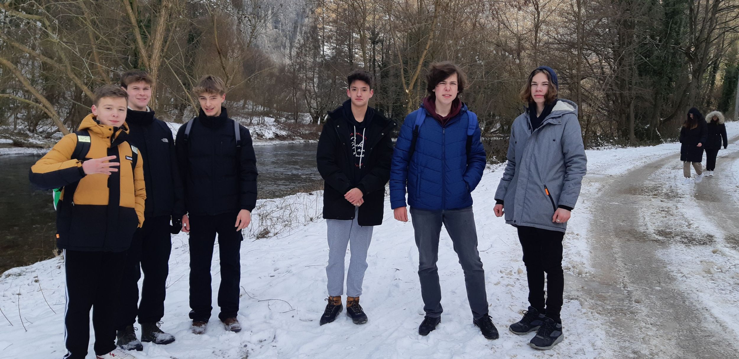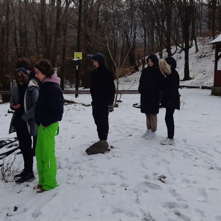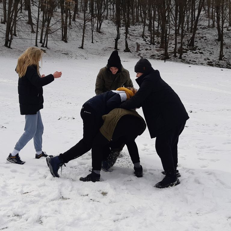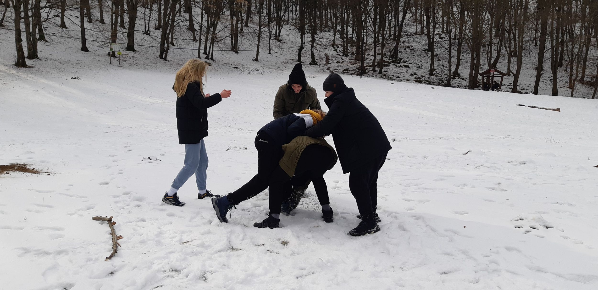 Visszafelé egy másik lengőhídnál megálltunk kicsit hógolyózni, a havas tájban gyönyörködni.