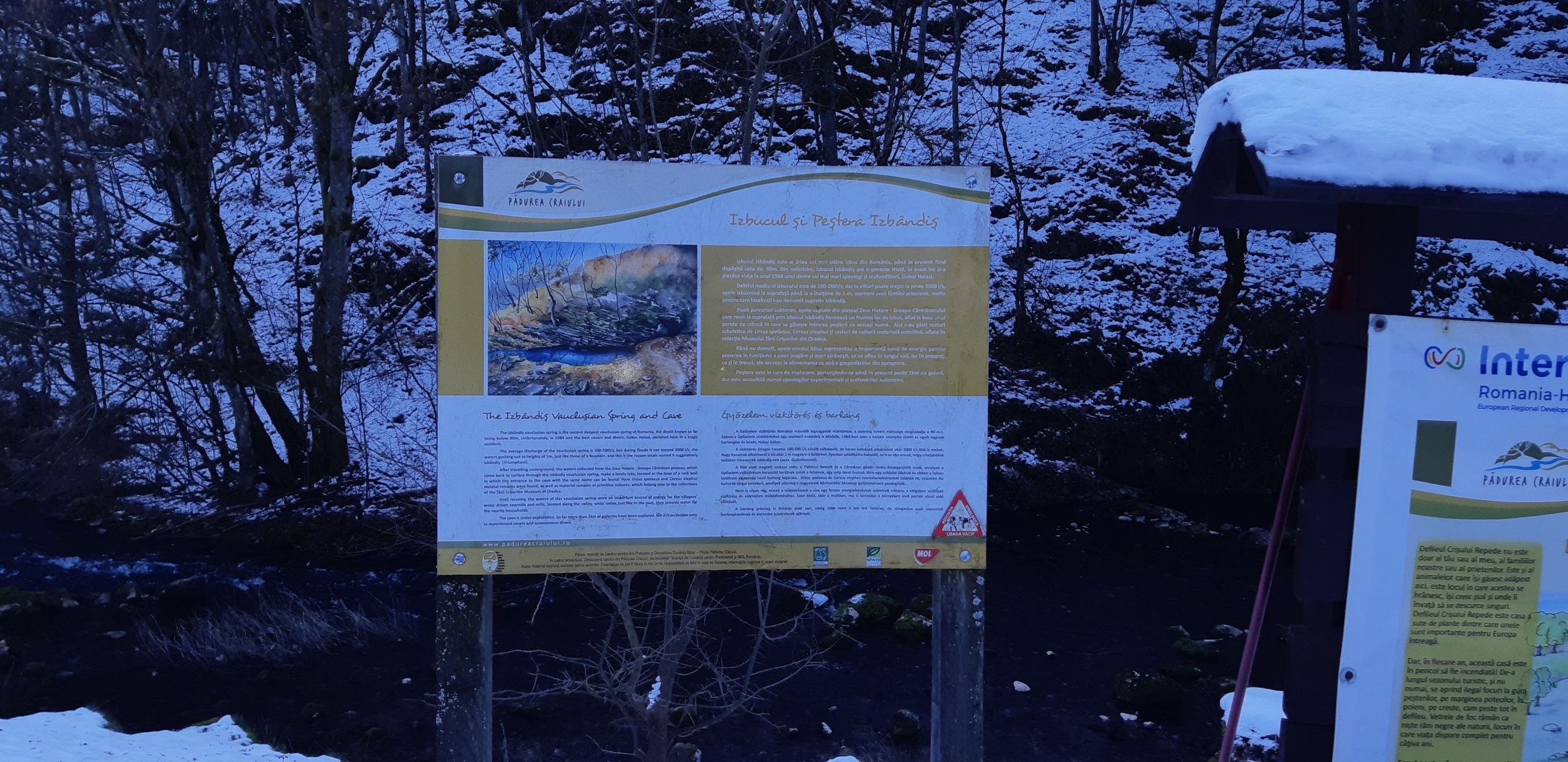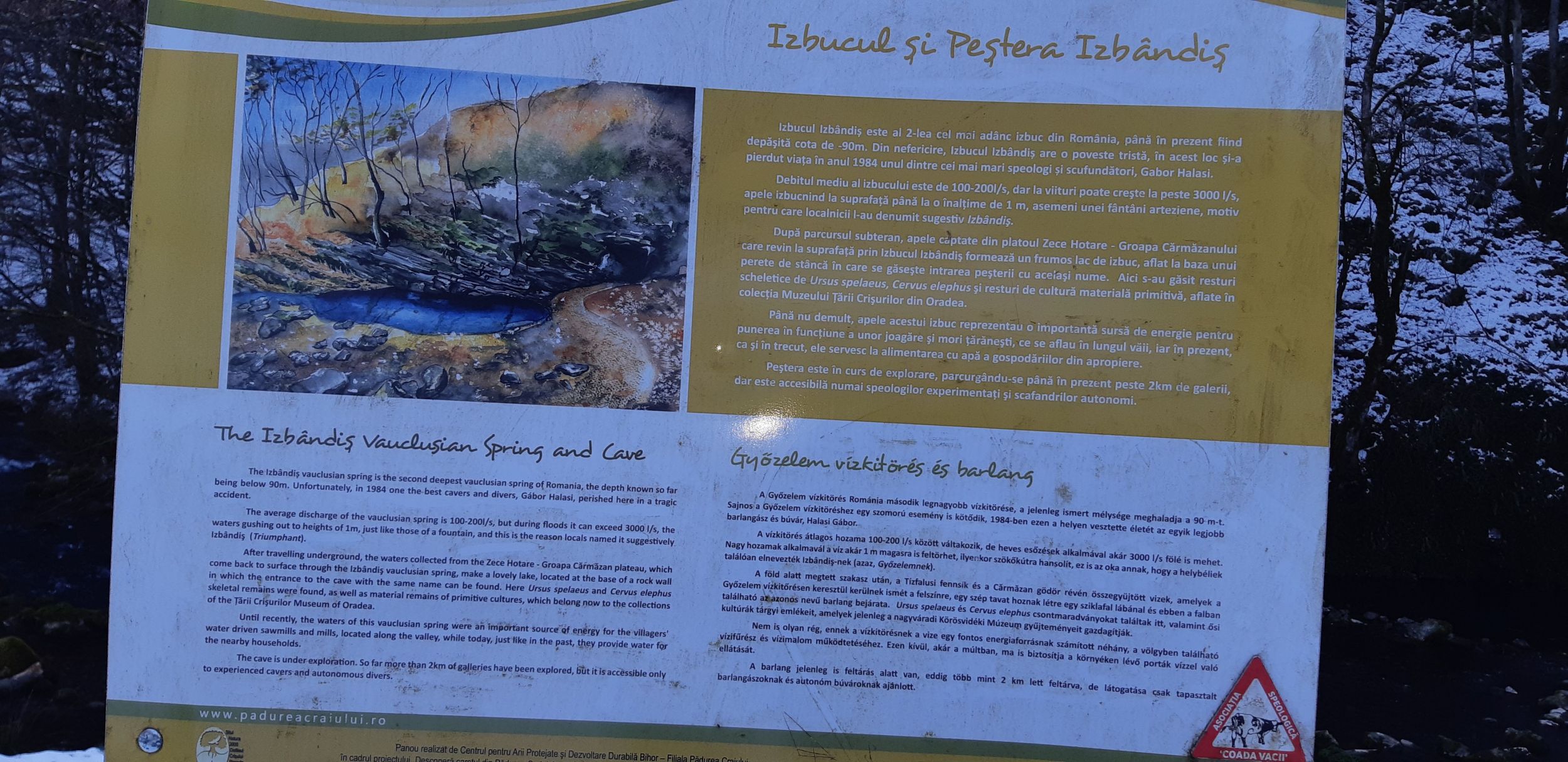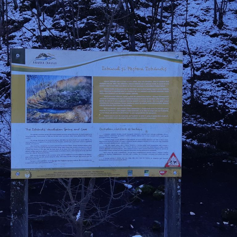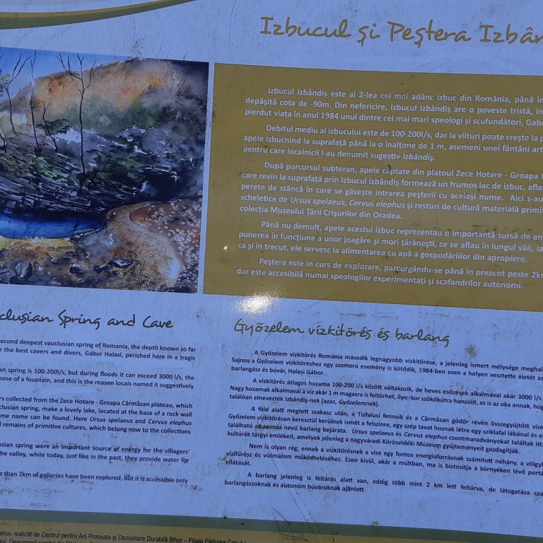 Másnap az Izbândiș vízkitörést és barlangot tekintettük meg. Ez a vízkitörés Románia második legmélyebb forrása, ugyanis a víz közel 100 méter mélyről tör fel itt a felszínre. A barlang mélyéről ered a bővizű Izbândiș patak, mely azután Sonkolyos felé veszi útját.