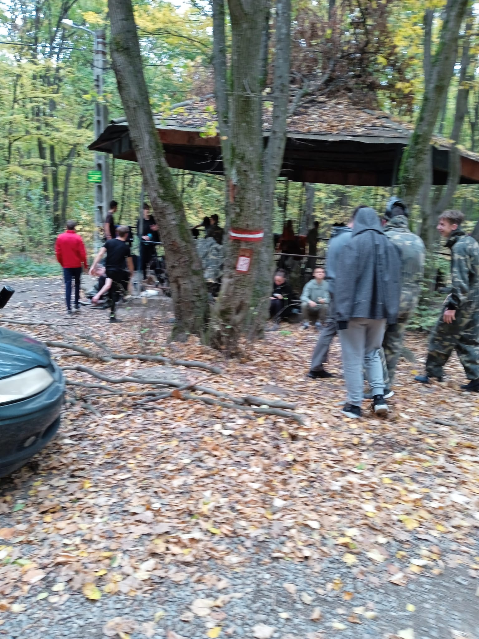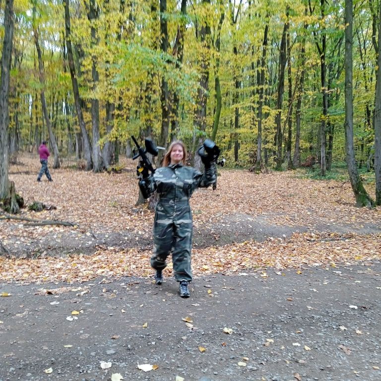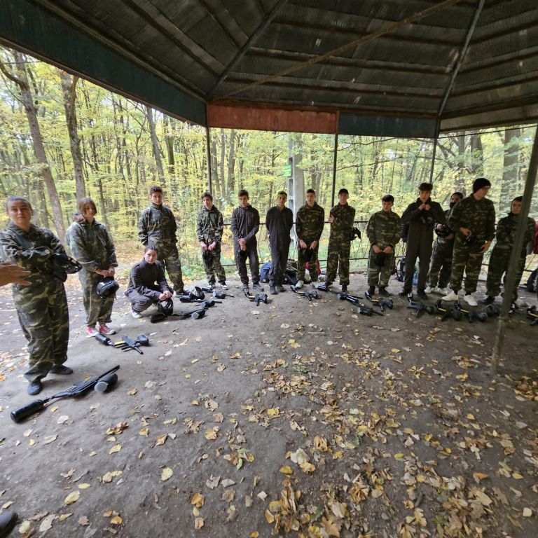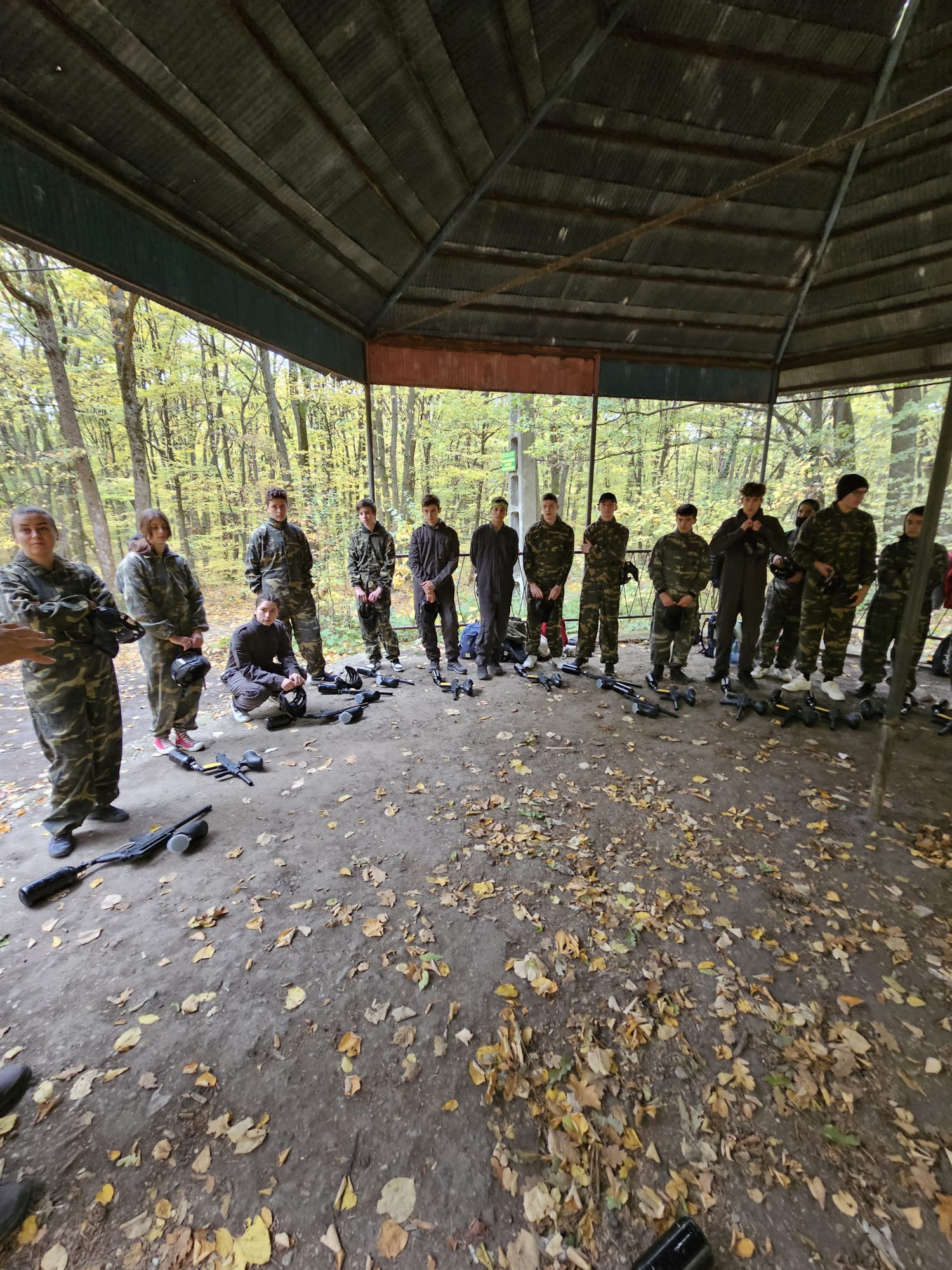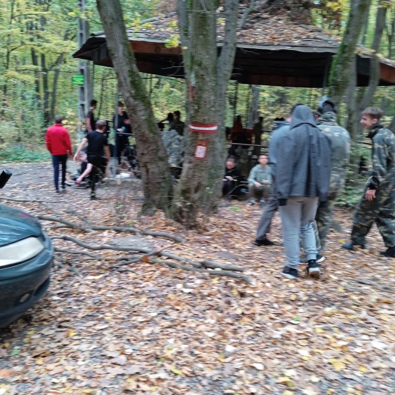Az erdőbe érve a feszültség levezetéseként, illetve az agresszív viselkedés megelőzése érdekében kipróbáltuk a paintballt.