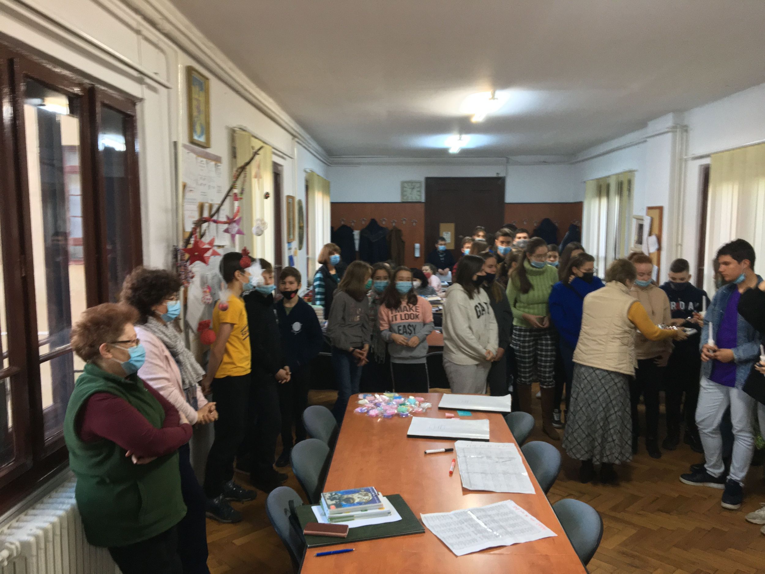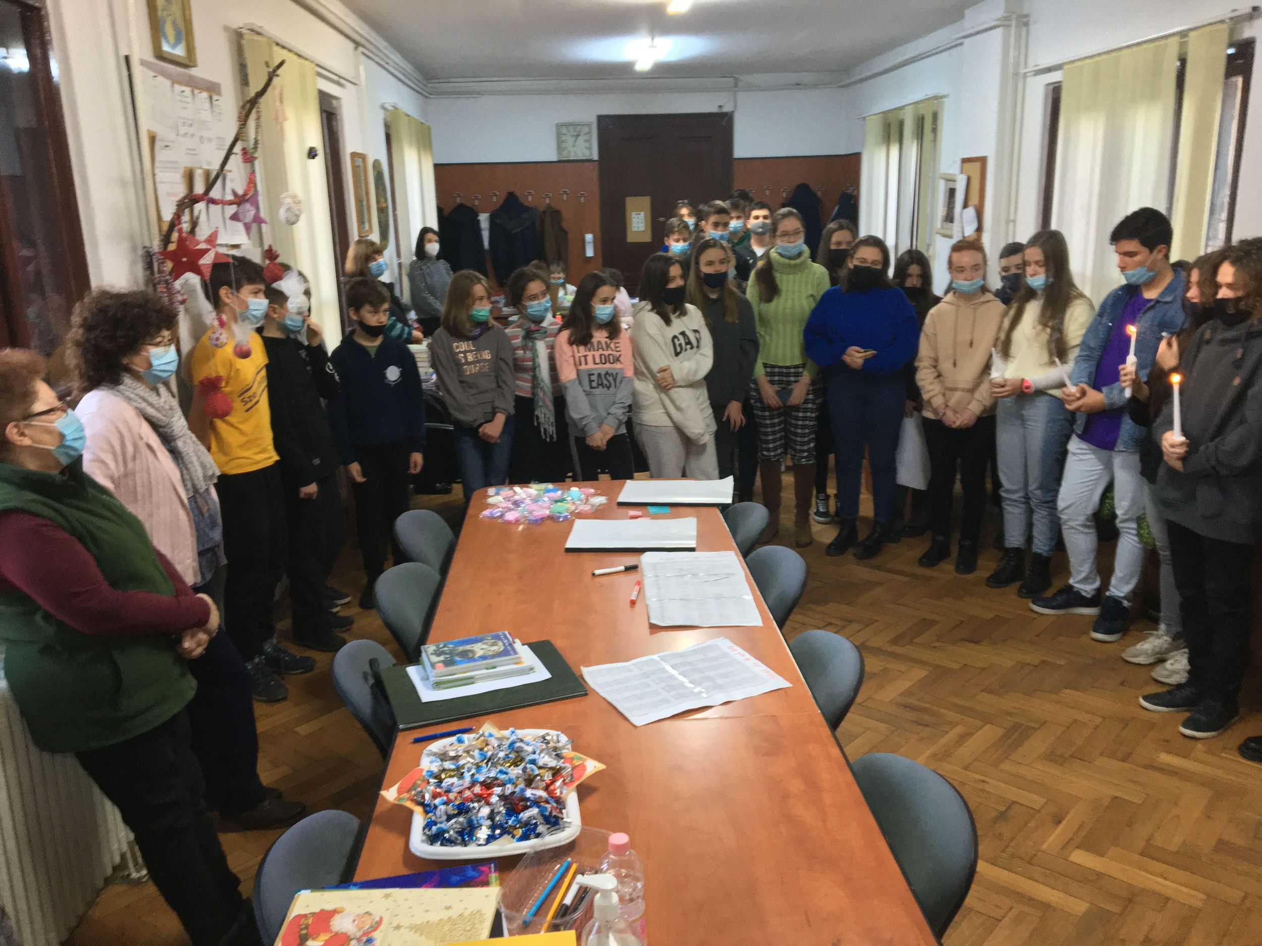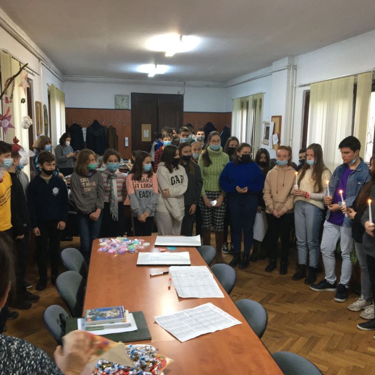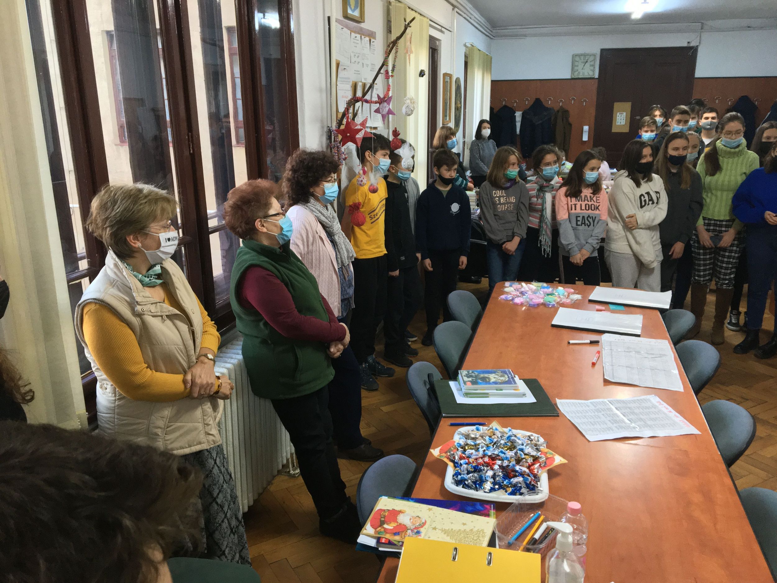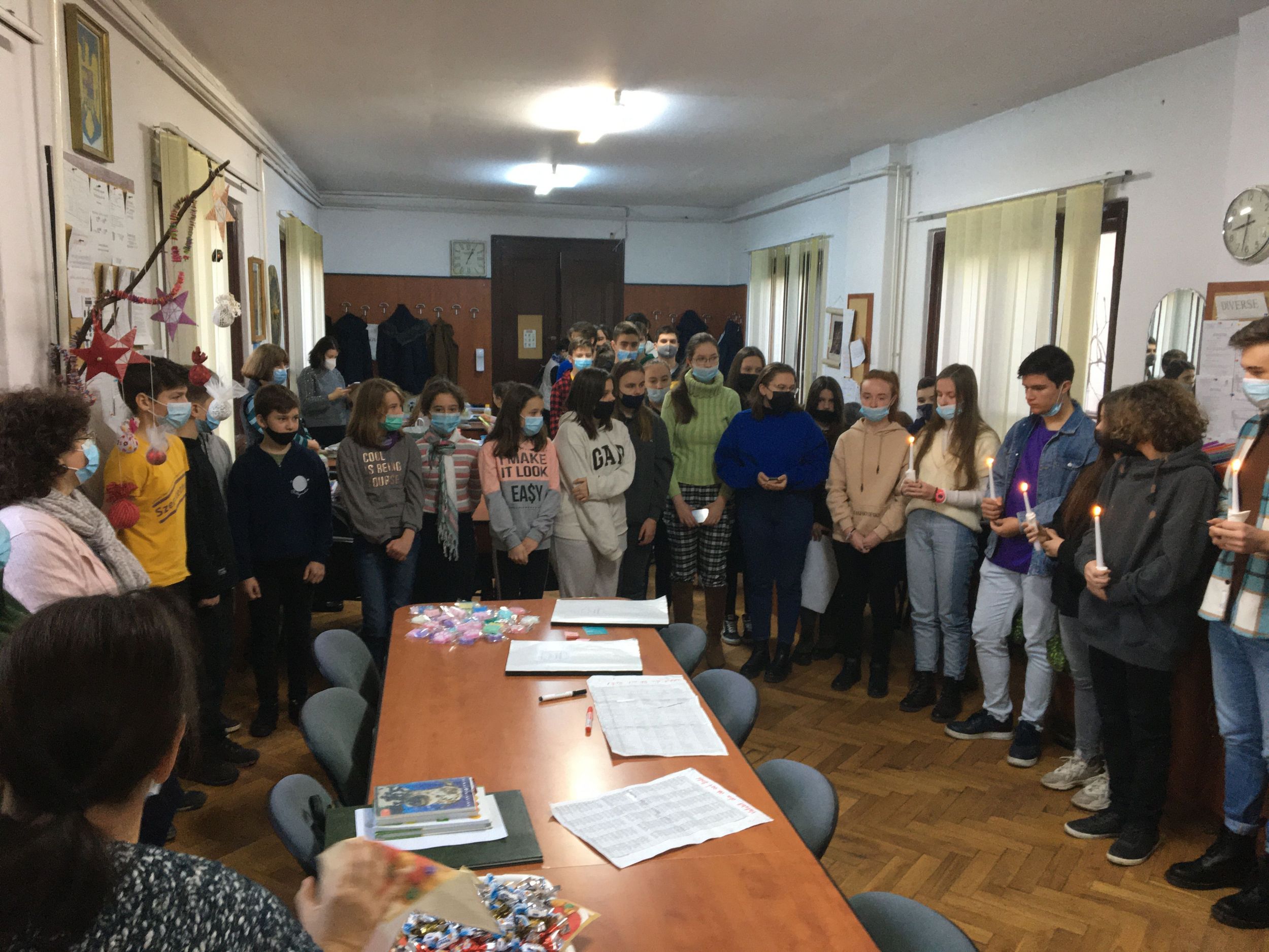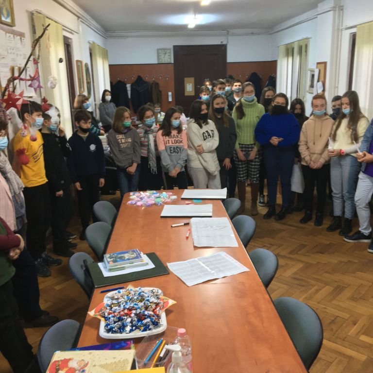 Több osztály diákjaiból összeállt gyermeksereg köszöntötte a tanárokat a közelgő ünnep alkalmából. Megható közös éneklés és versmondás, gyertyagyújtás tette teljessé a karácsonyi hangulatot. A diákokat Módi Kinga református vallástanárnő készítette fel.