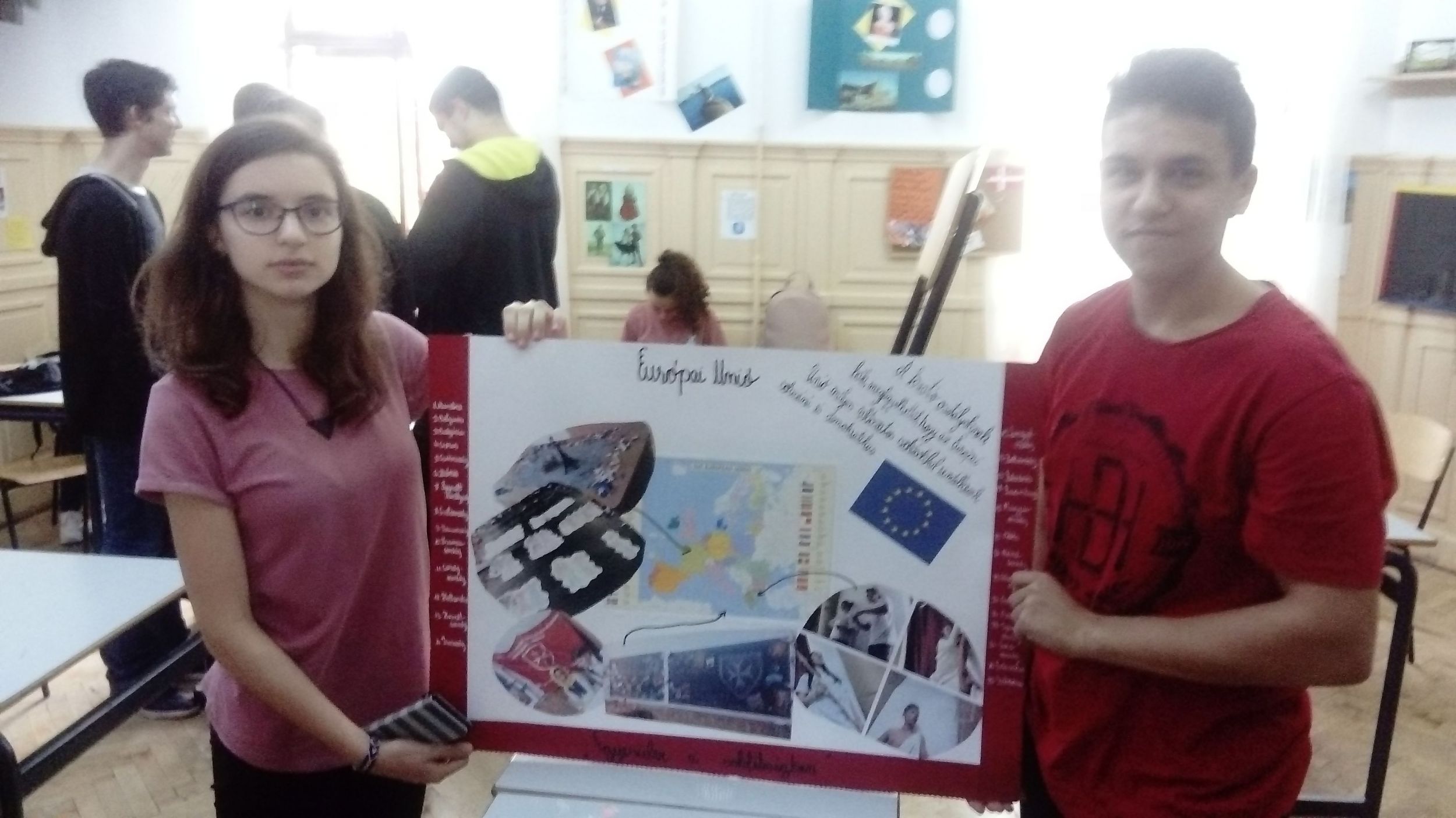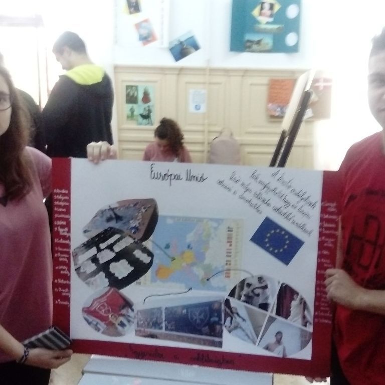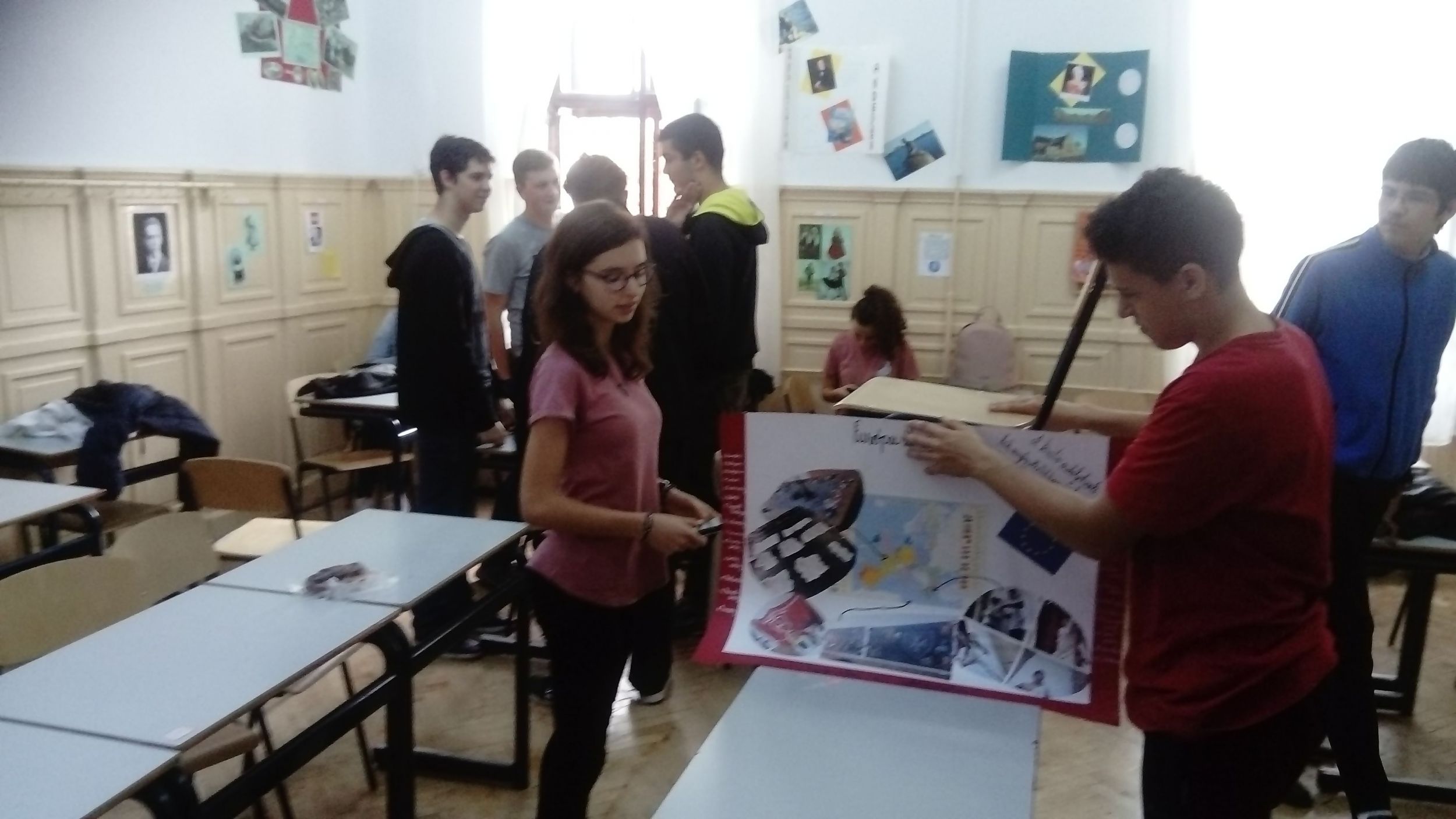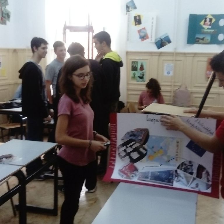 A 10.C-s diákok, miután előző nap megbeszélték és kielemezték a látottakat, hallottakat, elkészítették az osztály közös plakátját. Röviden a lényege, az alapgondolata a plakátnak: Európa nagyon sokszínű, változatos kultúrájú népek hazája, ahol a demokratikus berendezkedés minden ország alapjellemzője, s igy megvalósul egyfajta egység a sokszínűségben. A gyerekek 11 és 12 óra között leadták szavazataikat, míg a tanárok ugyanekkor végigjárva az osztályterméket szintén szavaztak. Hát kívancsian várjuk az eredményeket!... :)