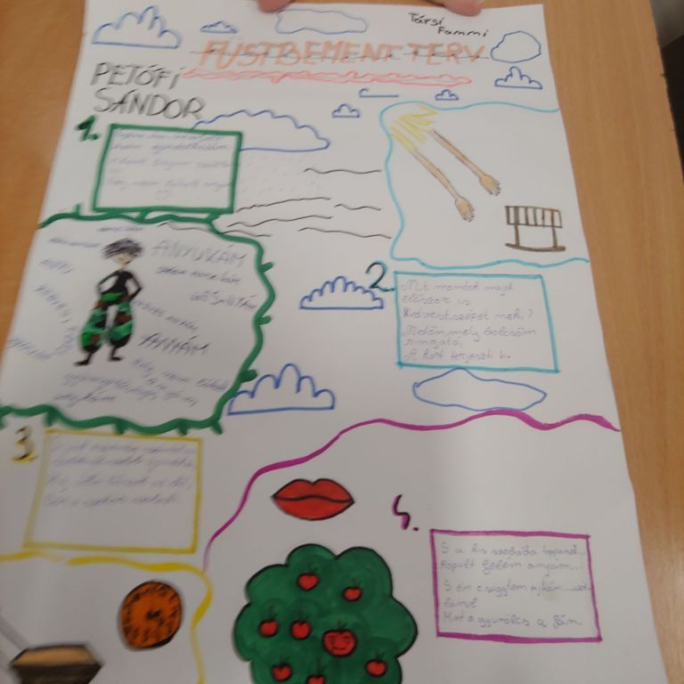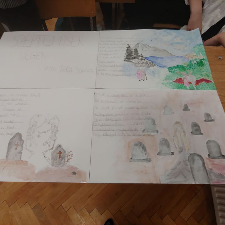 A vers-staféta után tovább folytatódott a Petőfi költészetének szentelt hét. A diákok ezúttal - csoportban vagy egyénileg - illusztrációkat készítettek egyik kedvelt Petőfi-versükhöz. Az illusztrációkat az osztályban bemutatták, 1-2 mondatos magyarázatban kiemelve, hogy milyen érzést, gondolatot, motívumot ábrázoltak alkotásaikon.