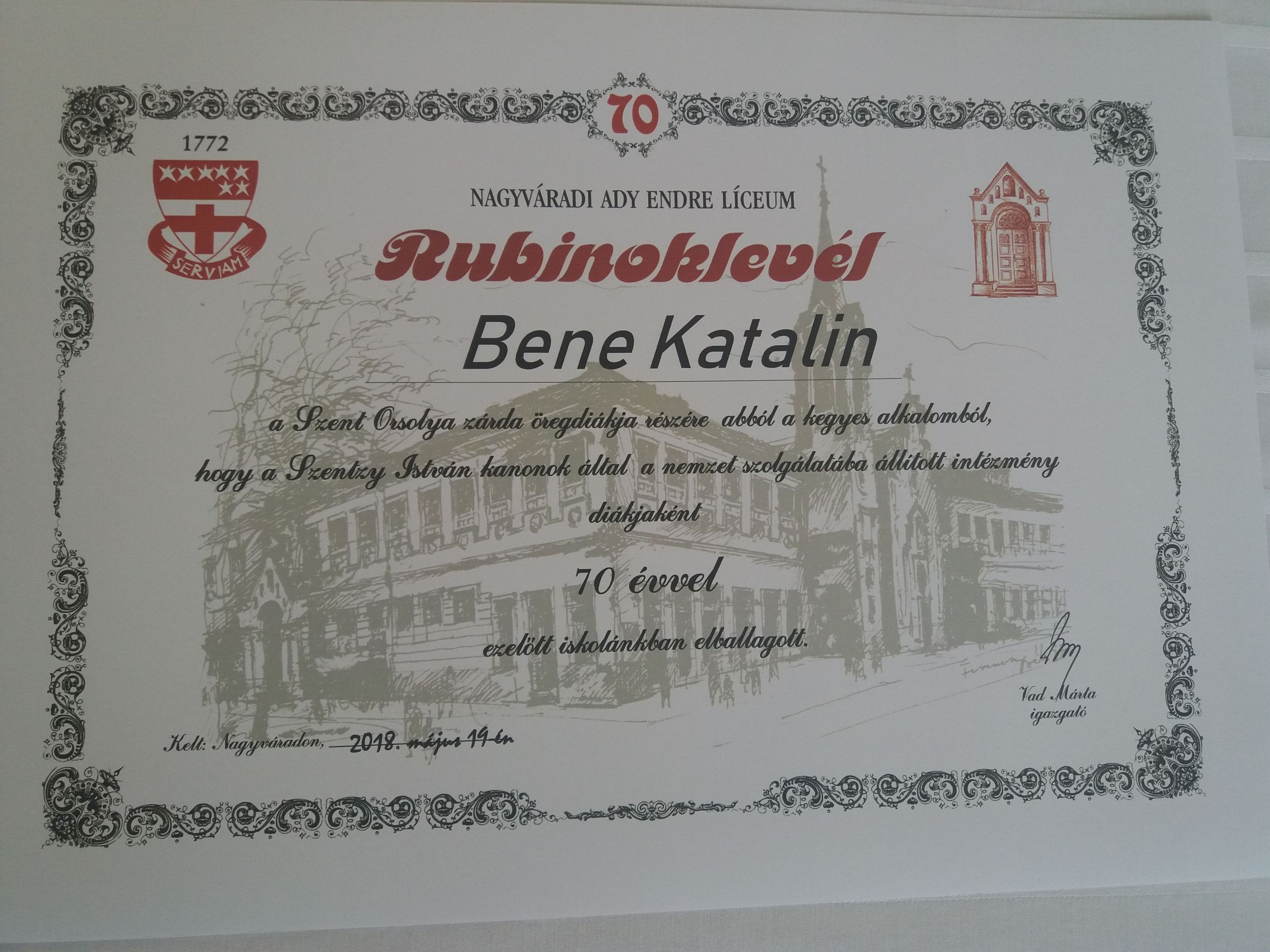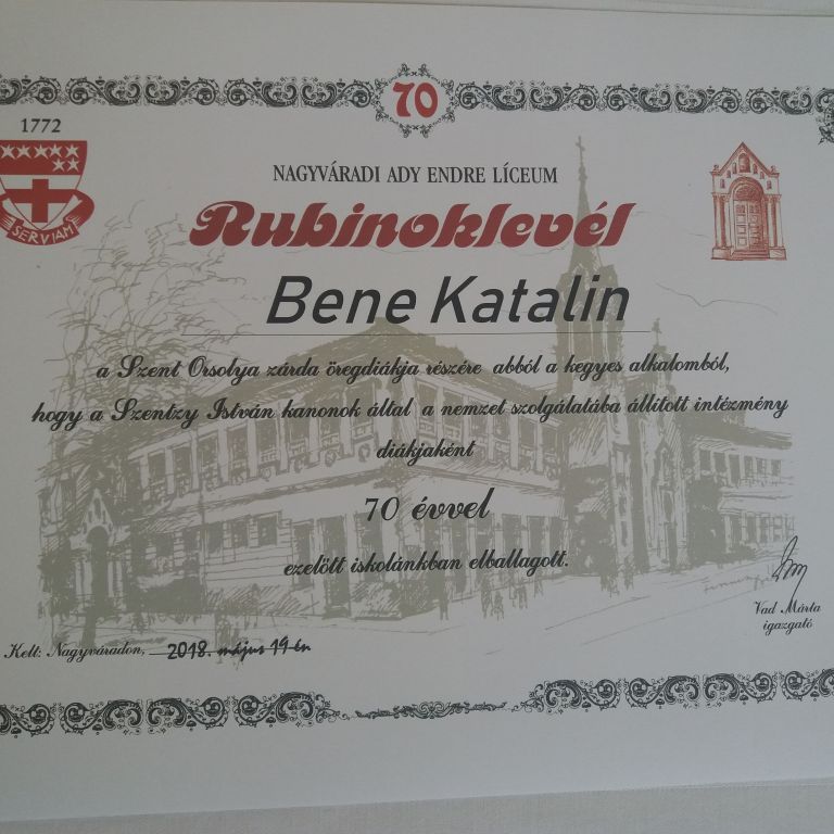 Eljött viszont a hetven éve végzett Molnár Bene Katalin, aki könnyes szemmel vette át az őt megillető rubinoklevelet. Megtudtuk: az Állami Magyar Tanítónőképző diákja volt, mely pont abban az évben, amikor érettségizett, egybeolvadt a Szent Orsolya zárda tanítóképzőjével. Ő maga soha nem tanult a jelenlegi Ady-líceumban, az utolsó évet a kecskeméti zsidó líceumban végezte, ahol a tanítóképző épp helyet kapott, de az évfordulókat mindig itt ünneplik. Harminchét éven át tanított, ebből tizenöt évet Szalontán, a többit pedig Nagyváradon, s a biharpüspöki iskolából ment nyugdíjba 1985-ben. Leginkább az utolsó osztályának diákjaival tartja a kapcsolatot, hozzájuk mintha jobban kötődött volna, mint a többiekhez, „anyjuk is voltam, s ők is érezték a kötődést” – emlékezett vissza. Elbüszkélkedett két unokájával és négy dédunokájával, s boldogan újságolta, hogy hamarosan Bukarestbe utazik, a legkisebb dédunoka keresztelőjére.