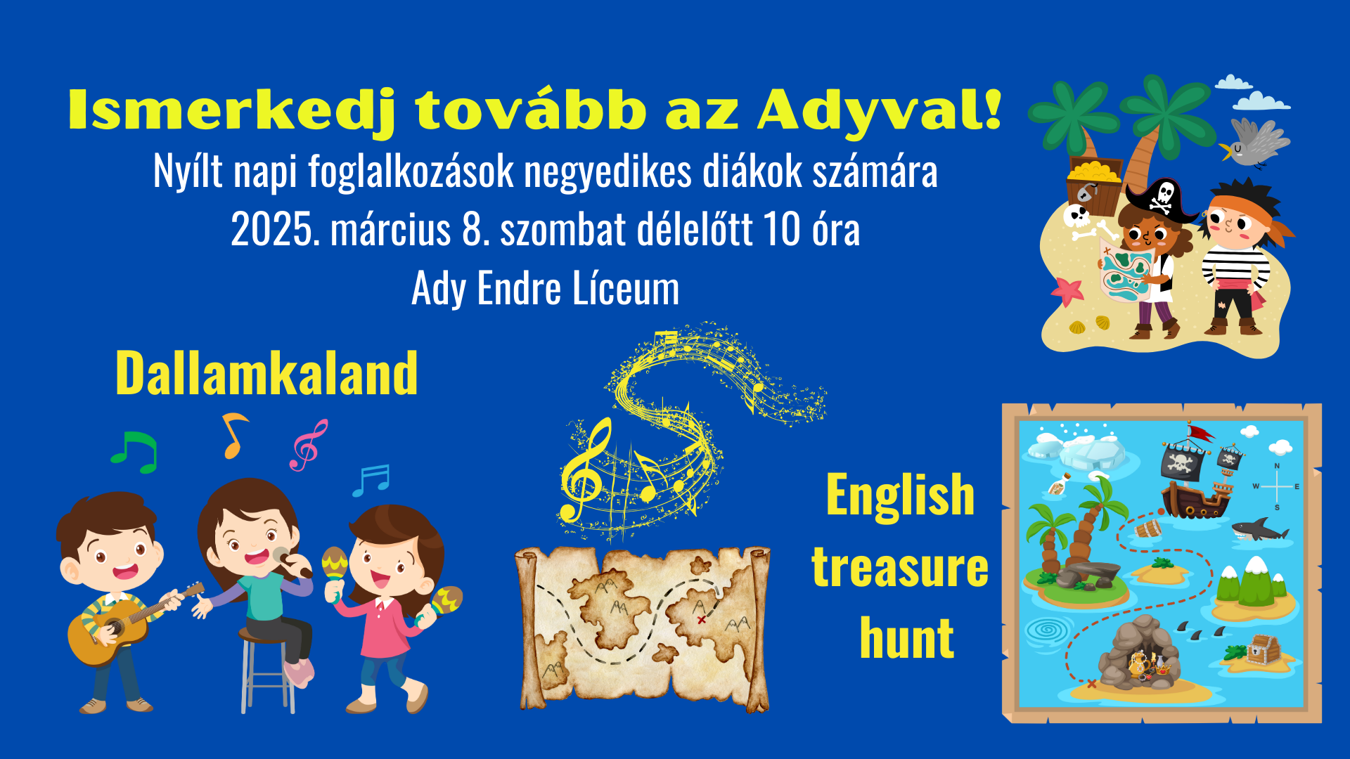 Szeretettel várjuk ismét a negyedikes diákokat 2025. március 8-án, szombaton délelőtt 10 órára az Ady Endre Líceumba, ahol a diákok olyan, az iskolára jellemző interaktív foglalkozásokon vehetnek részt, mint a Dallamkaland, valamint az English treasure hunt.